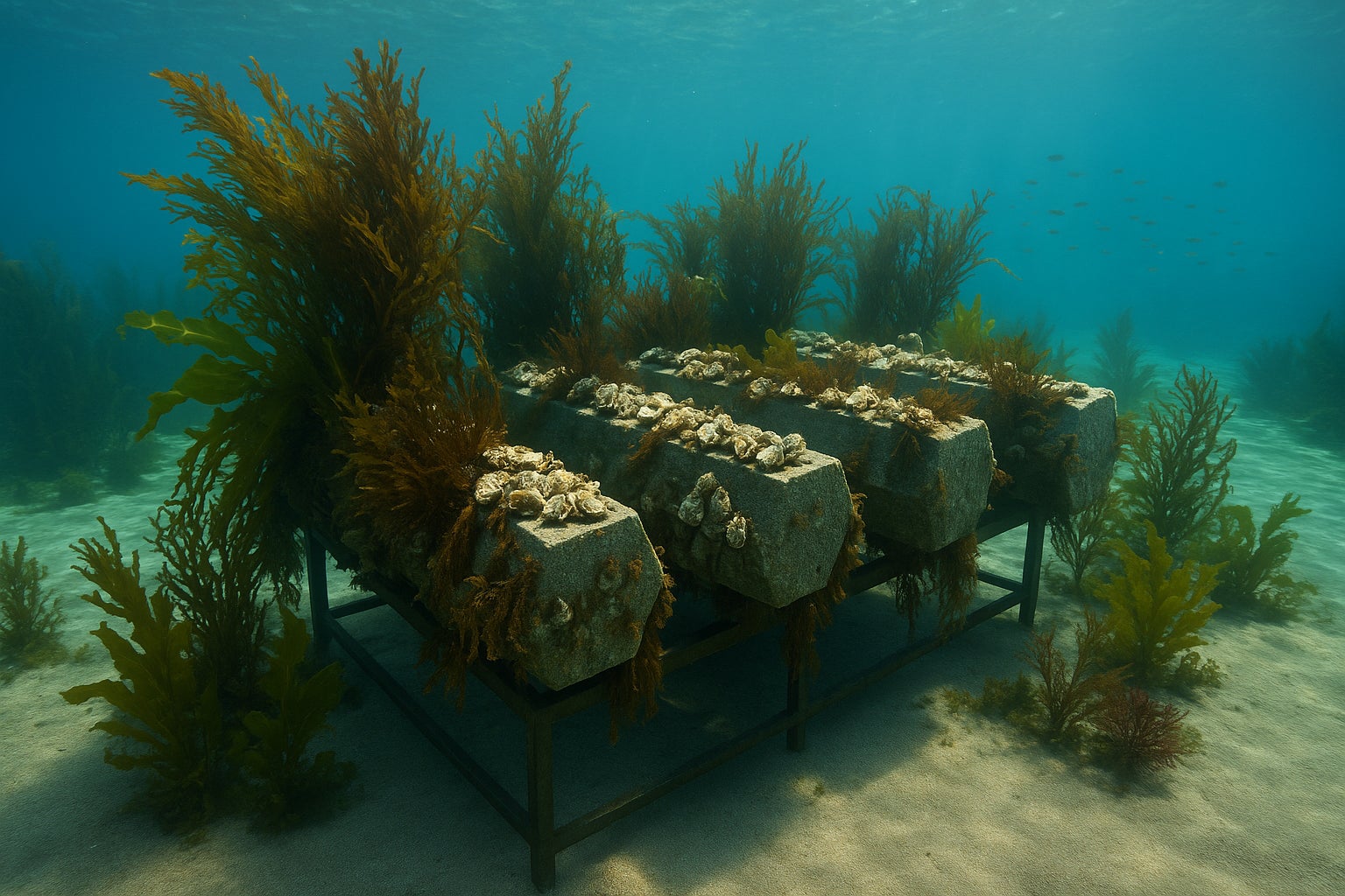 この「有機体ブロック」は、これまで海藻が自然定着しにくかったコンクリート構造物に対し、新たな選択肢を提供するものです。海藻類や微細生物の定着を支援しながら、生態系を底辺から再構築するための“生きた足場”として活用可能です。特に藻場の再生としての、アカモクやワカメといった海藻の繁茂は、大気中CO₂固定や水質改善に資する大きな可能性を秘めています。