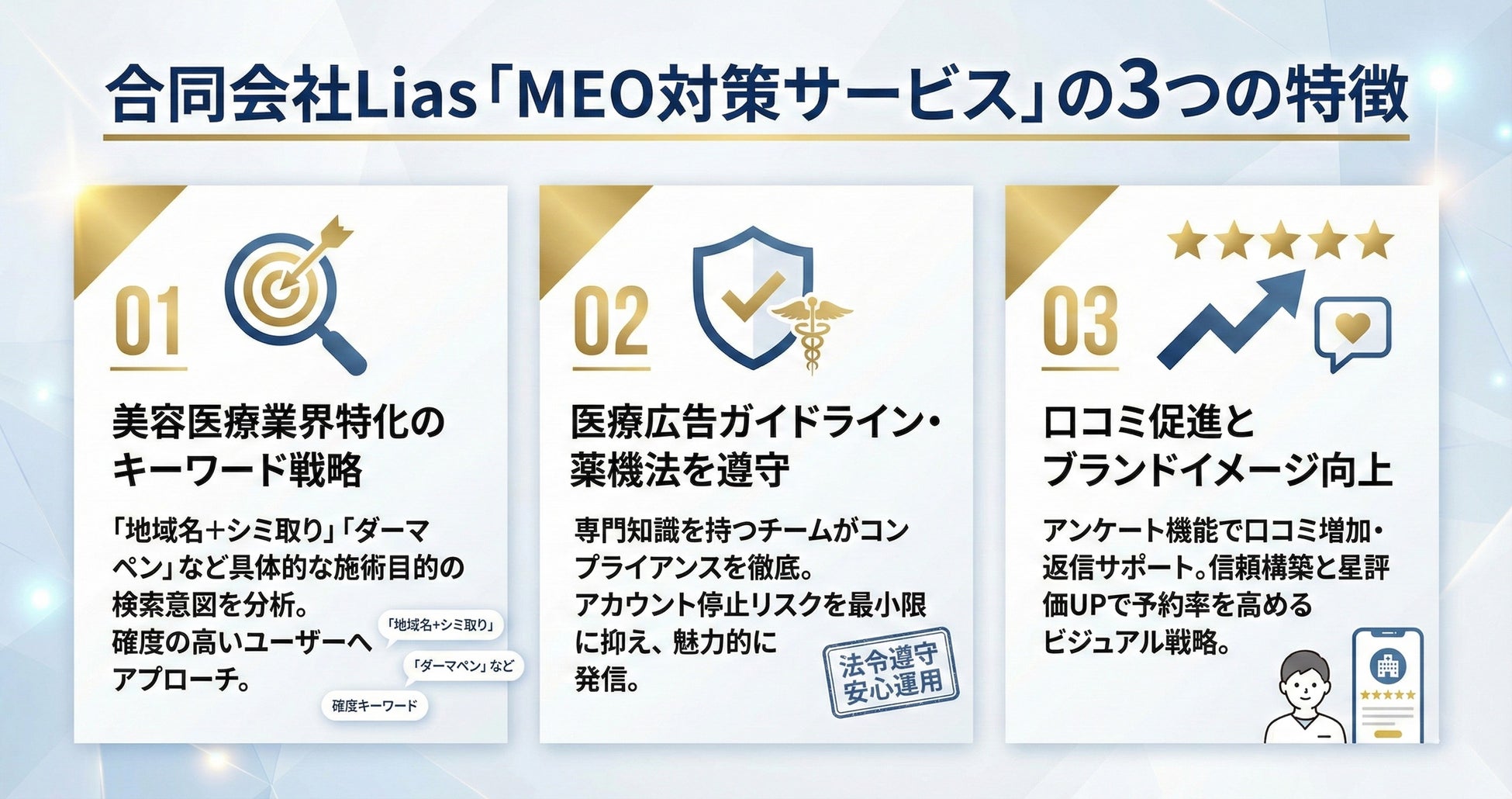 ■ 合同会社Lias「MEO対策サービス」の3つの特徴