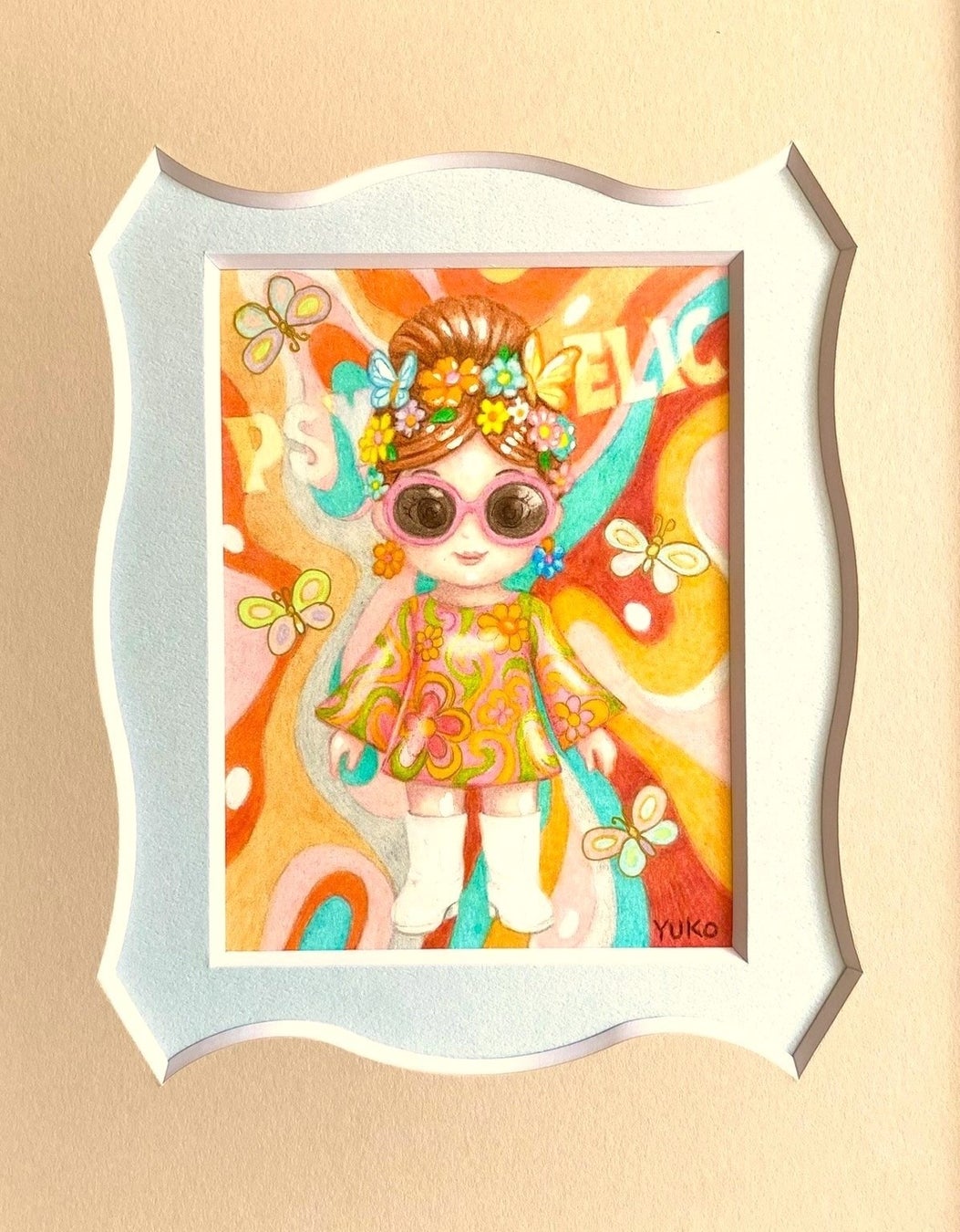 色鉛筆のやわらかな発色と繊細は筆致で描かれた女性たちは、横顔やどこかうつむき加減で、 ふと立ち止まり、静かに思いを馳せているようです。 背景には、懐かしい花柄や動物柄をあしらい、まるで彼女 たちが模様の中にひそむ物語と、静かに対話しているようにも見えるかもしれません。 遠い記憶の片すみにあった光景や気配を、そっとすくい取るような作品をそろえました。 また、レトロファッションに身を包んだ人形をモチーフにした作品も展示販売しています。懐かしくて新鮮、そんなレトロな気分をぜひ会場でお楽しみください。