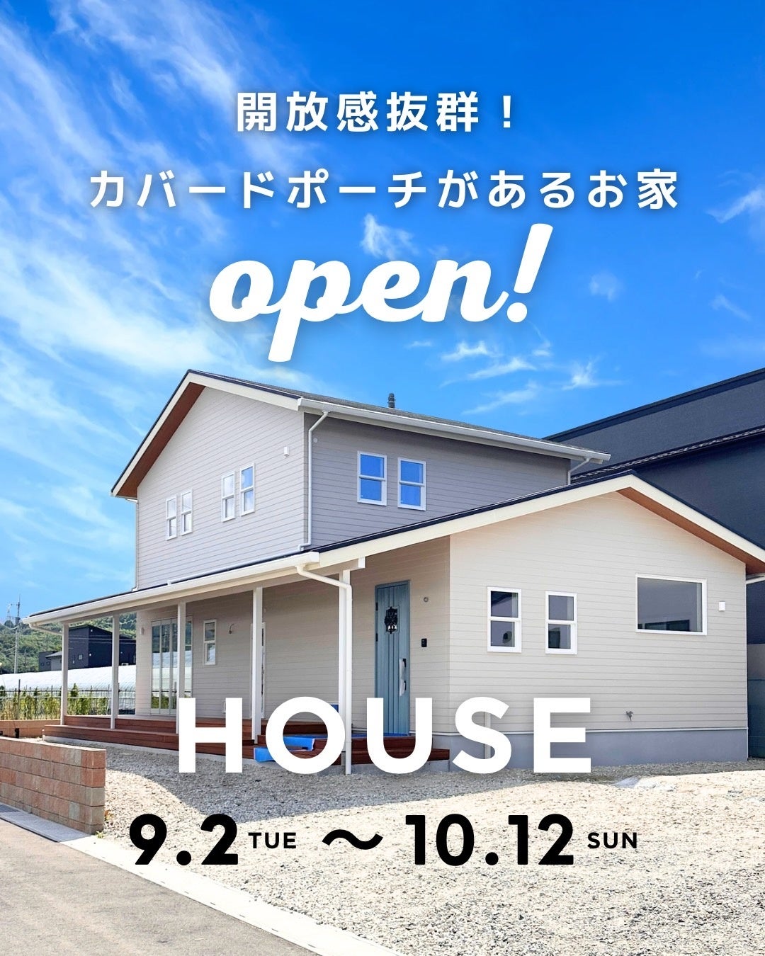 2025年9月2日〜10月12日、唐津市浜玉町で完成見学会開催。カバードポーチで日差しを気にせずのびのび暮らせる理想の住まい。(完全予約制)