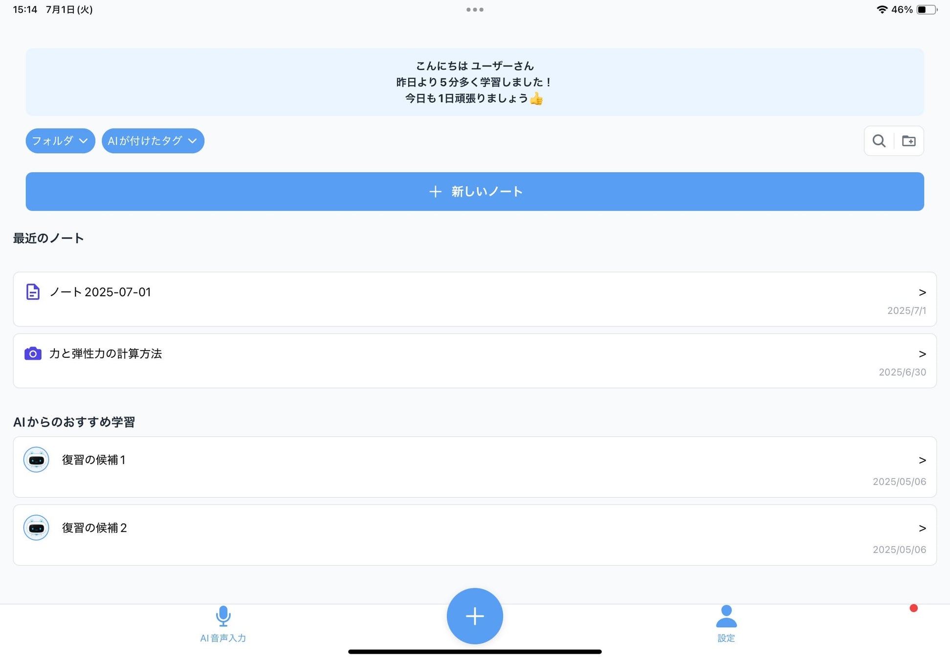 直感的なノート管理(作成・編集・整理)/AIによる自動タグ付け・フォルダ分類/AIからの応援リマインダーと復習提案/音声録音、写真スキャン、ファイルインポートへのクイックアクセス
