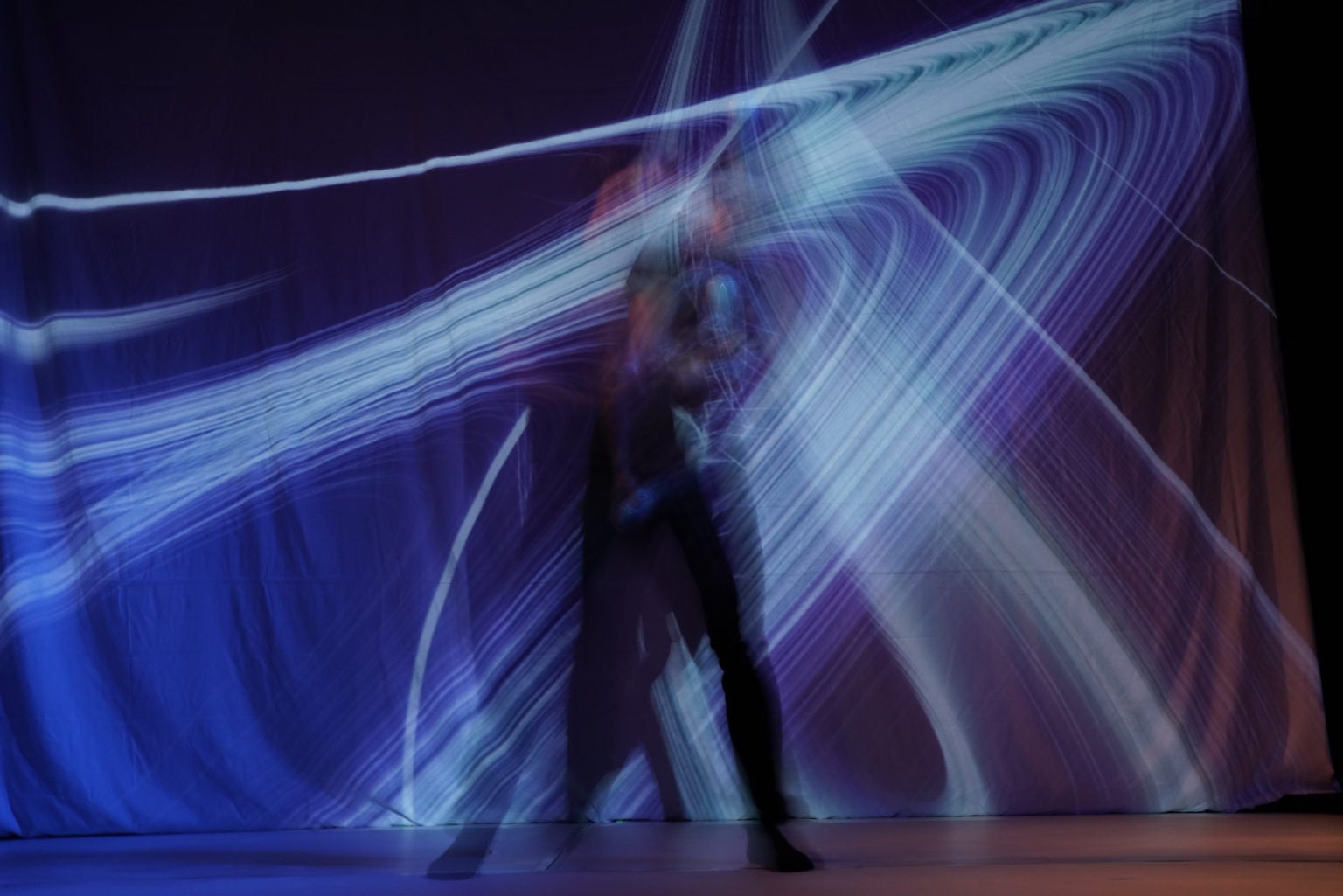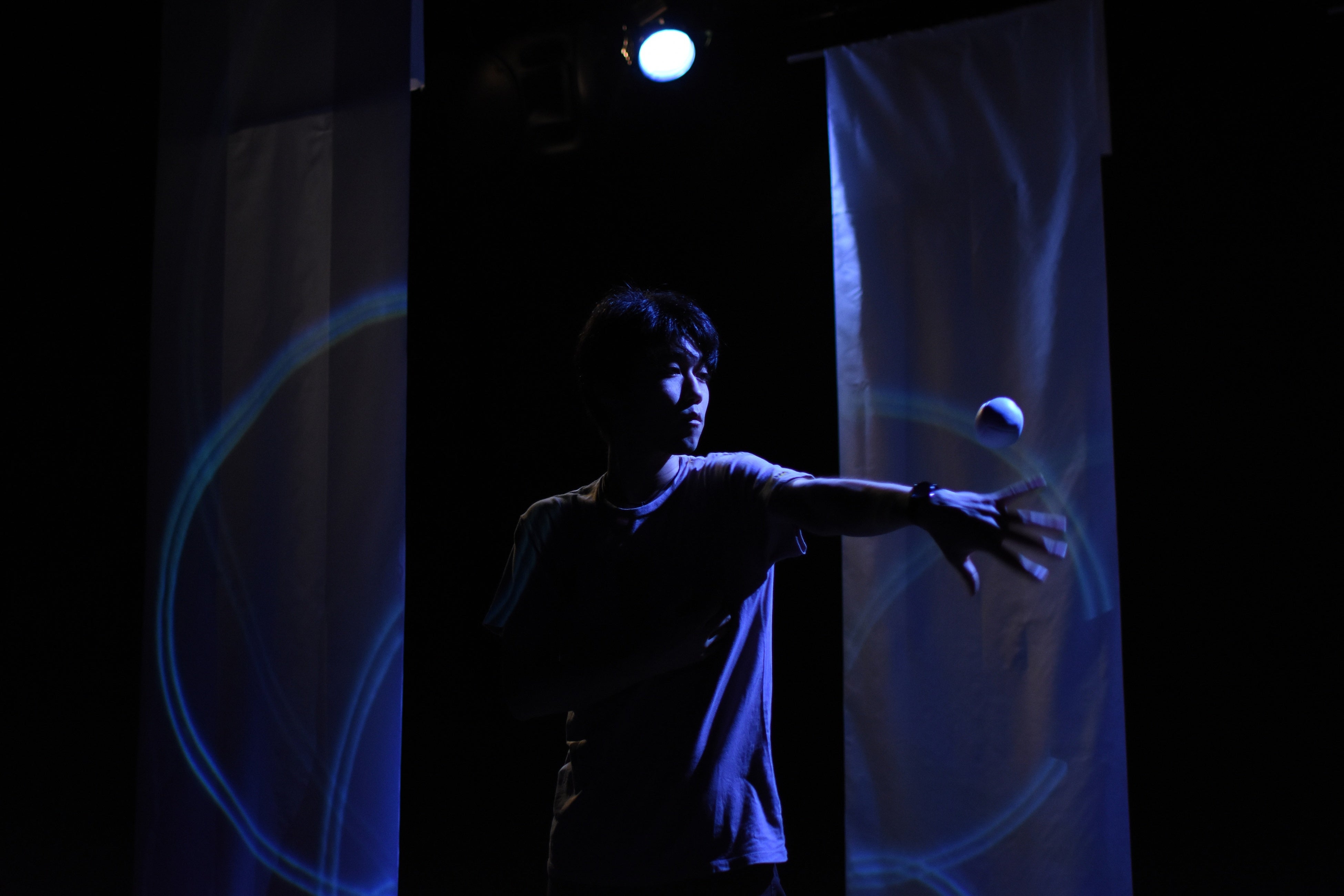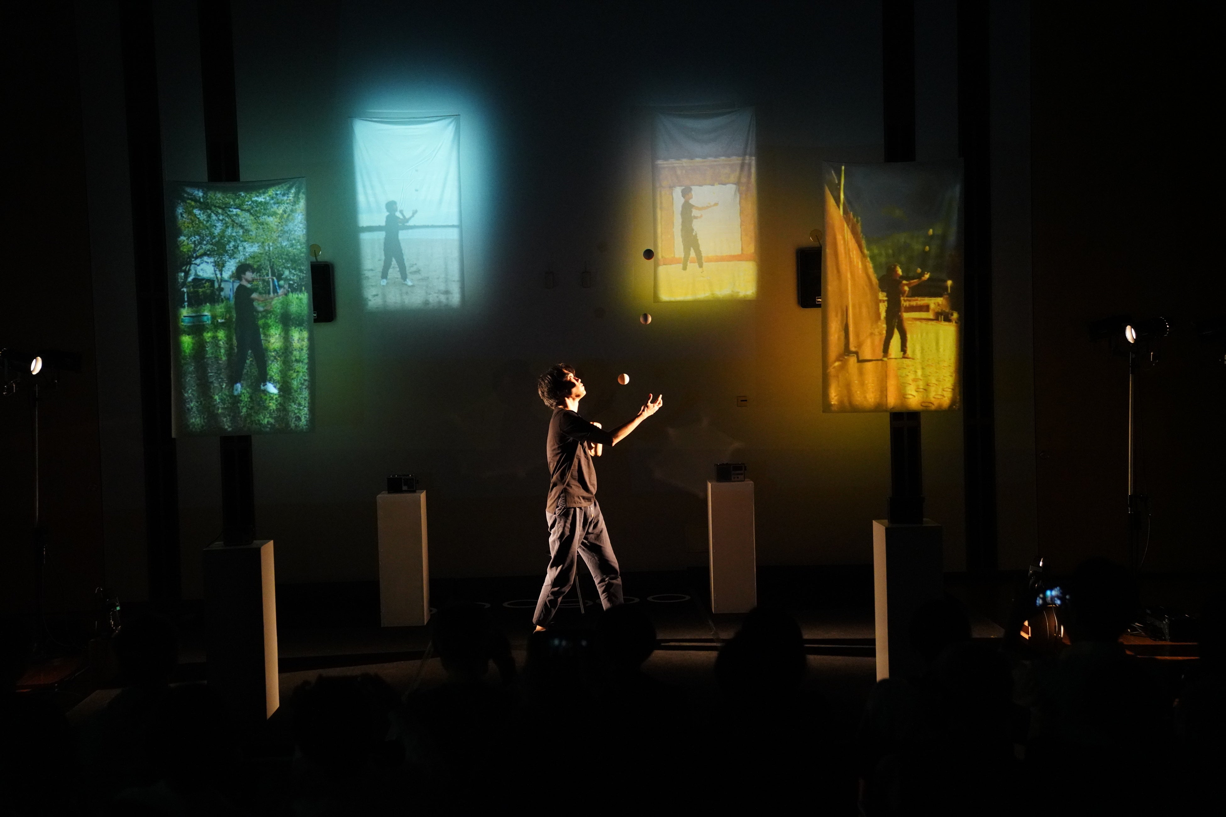 メインパフォーマーの岡本晃樹は、抽象性の高いジャグリング道具(ボールやリング)と、日常物(扇風機・カメラ)を同じモードで扱います。その中で、「身体」そのものがモノと化す瞬間すら描かれます。現実と虚構、実体と映像が交錯し、「これはどこまでが何か?」を問い直す空間が出現します。