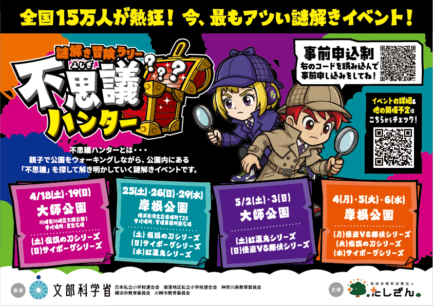 親子で楽しむ謎解きイベント「不思議ハンター」が、横浜市・川崎市内の公園で4月~6月に開催。「伝説の刀」「怪盗VS探偵」など新シリーズが続々登場。親子で学び体験できる冒険型謎解きイベントです!