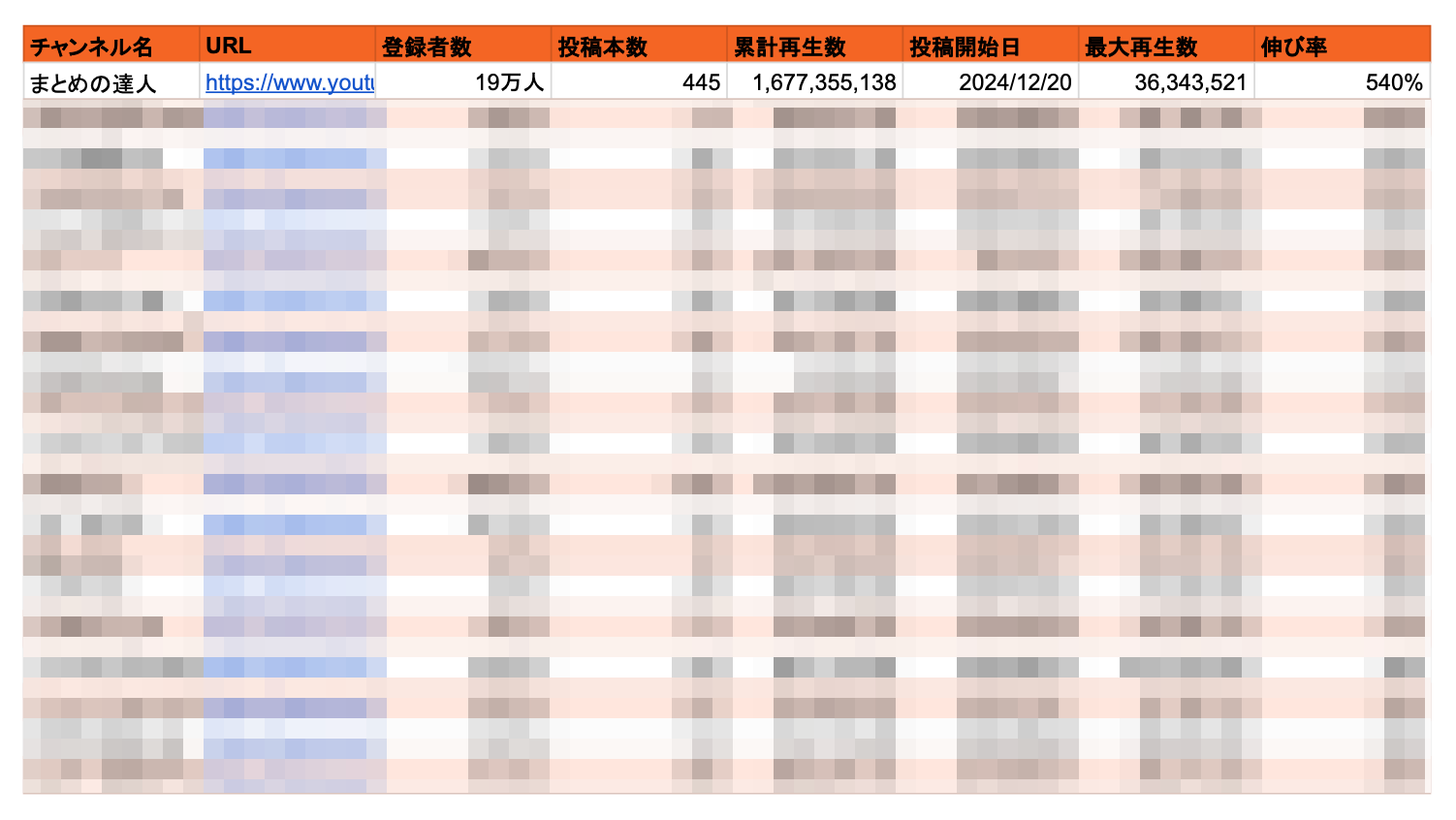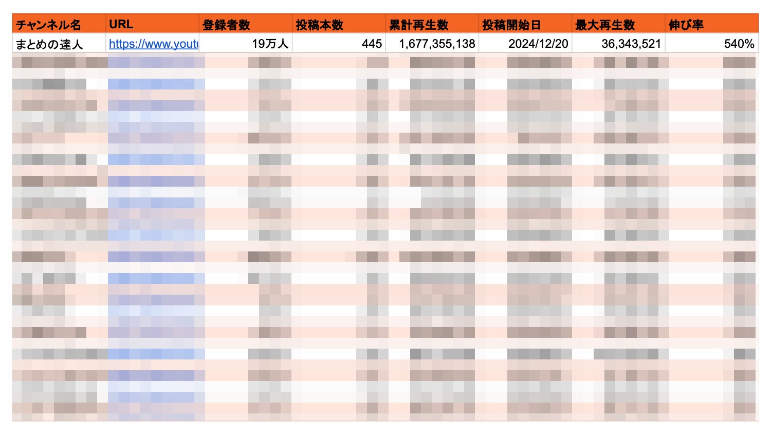 各チャンネルの登録者数・投稿数・再生数などの基本データ