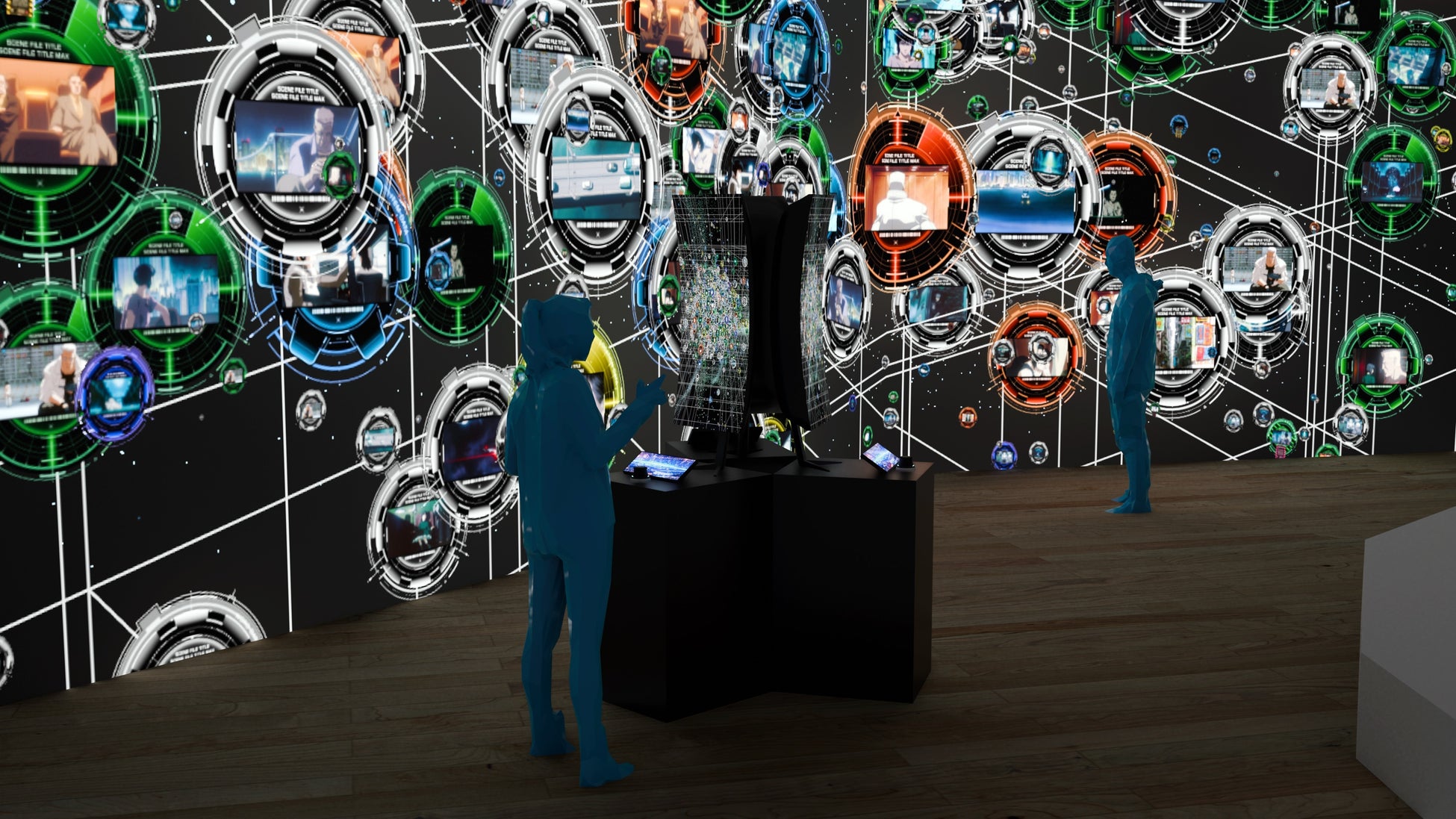 会場の壁一面を覆う巨大なマッピング空間では、来場者が情報の海を泳ぎ、数々の作品シーンを呼び覚まし、空間そのものが呼吸するように変化していく。体験者自身の「思考」や「探索」が展示の一部となる全能検索インスタレーションです。