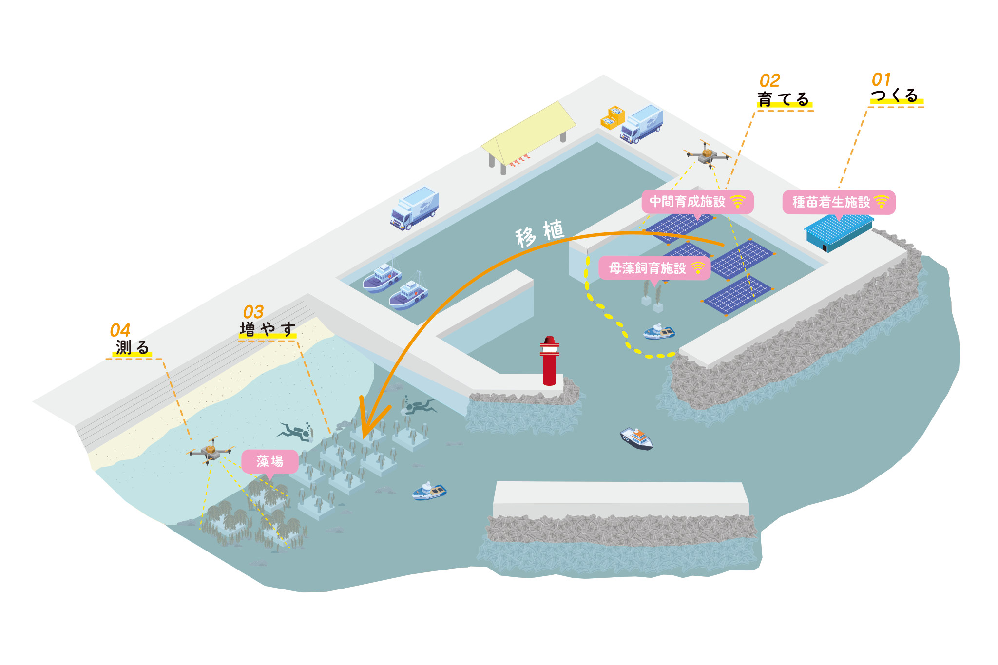 ブルーカーボンを推進するために、漁港を利活用して大量かつ安定的に海藻を育成し、海藻移植用カートリッジと海藻育成用基盤ブロックを用いて周辺海域へ効率的に移植することにより、広域な藻場の保全と回復を実現する海藻供給システム(海藻バンク)を構築します。