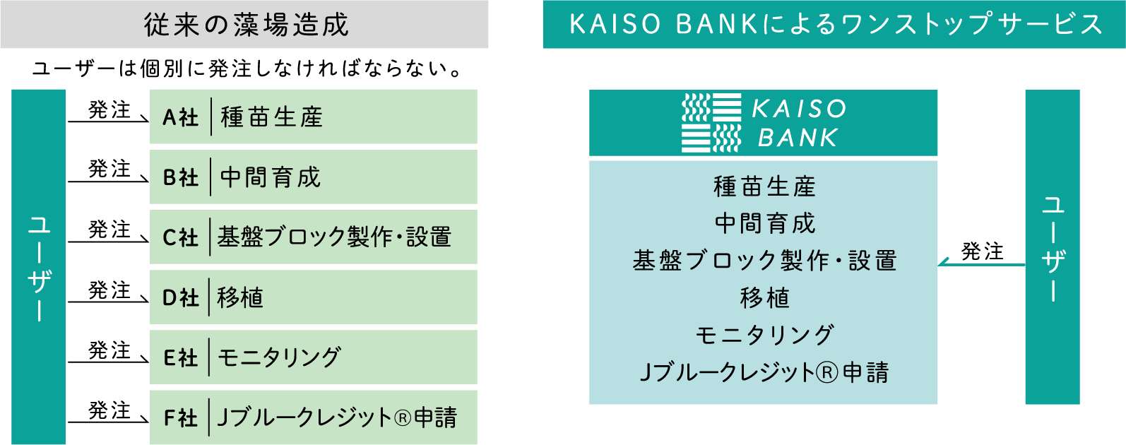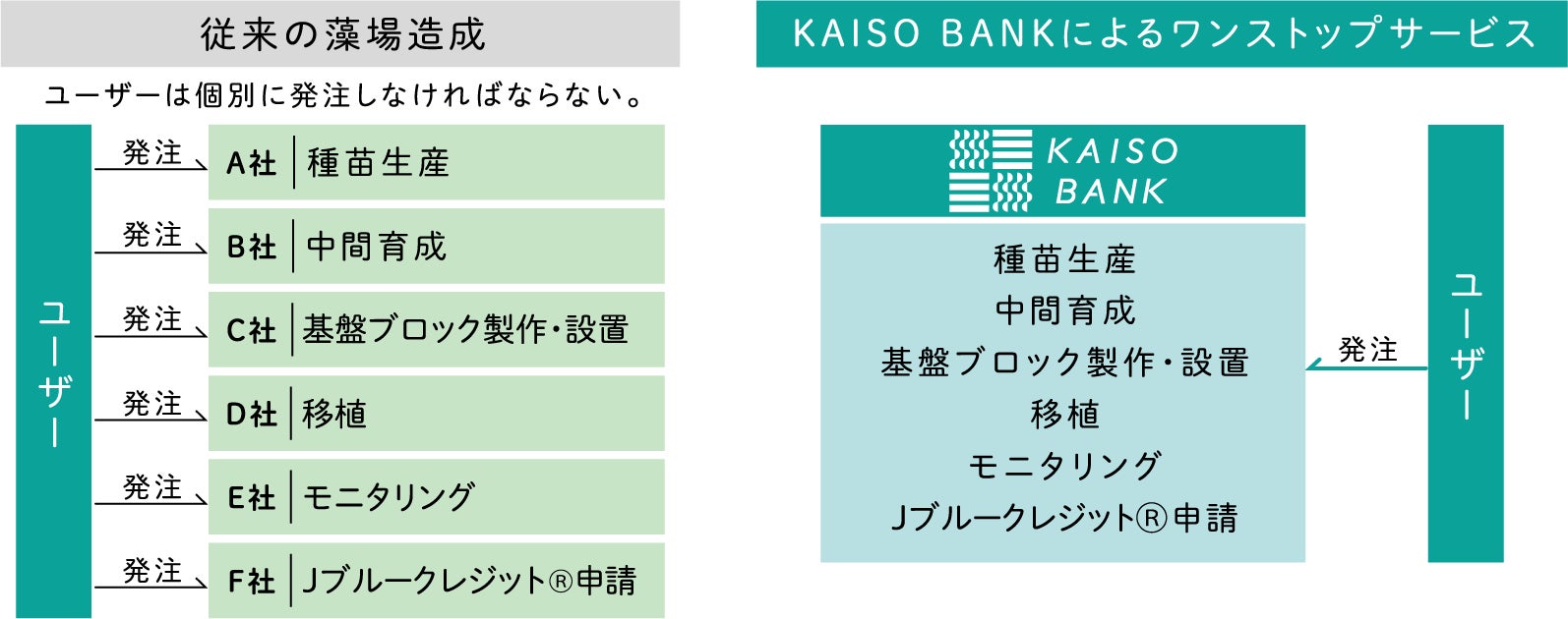 KAISO BANKコンソーシアムとして包括的に対応可能であるため、種苗生産からJブルークレジットⓇ申請までワンストップサービスを開発・構築し、普及を目指します。