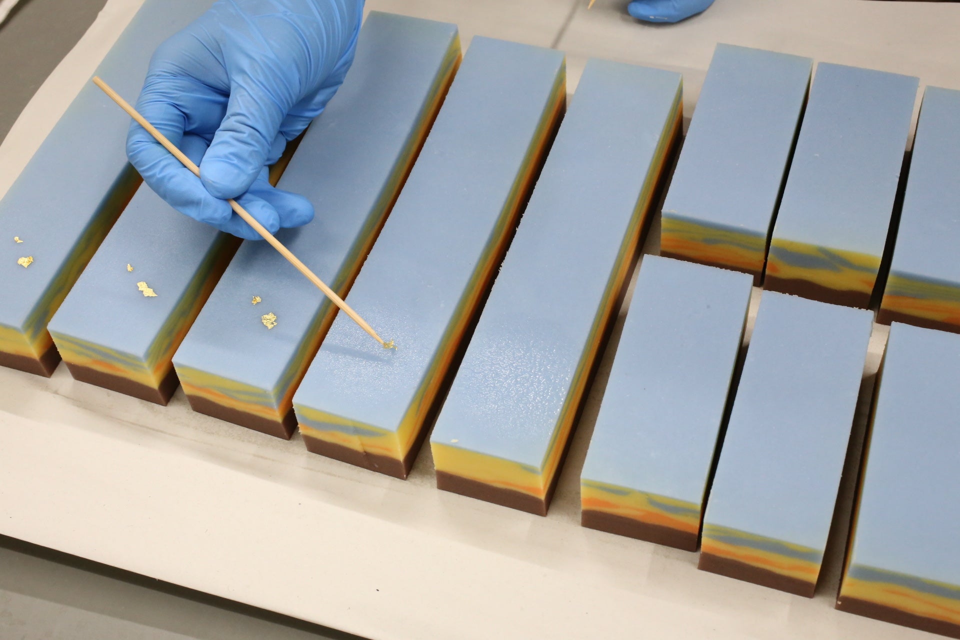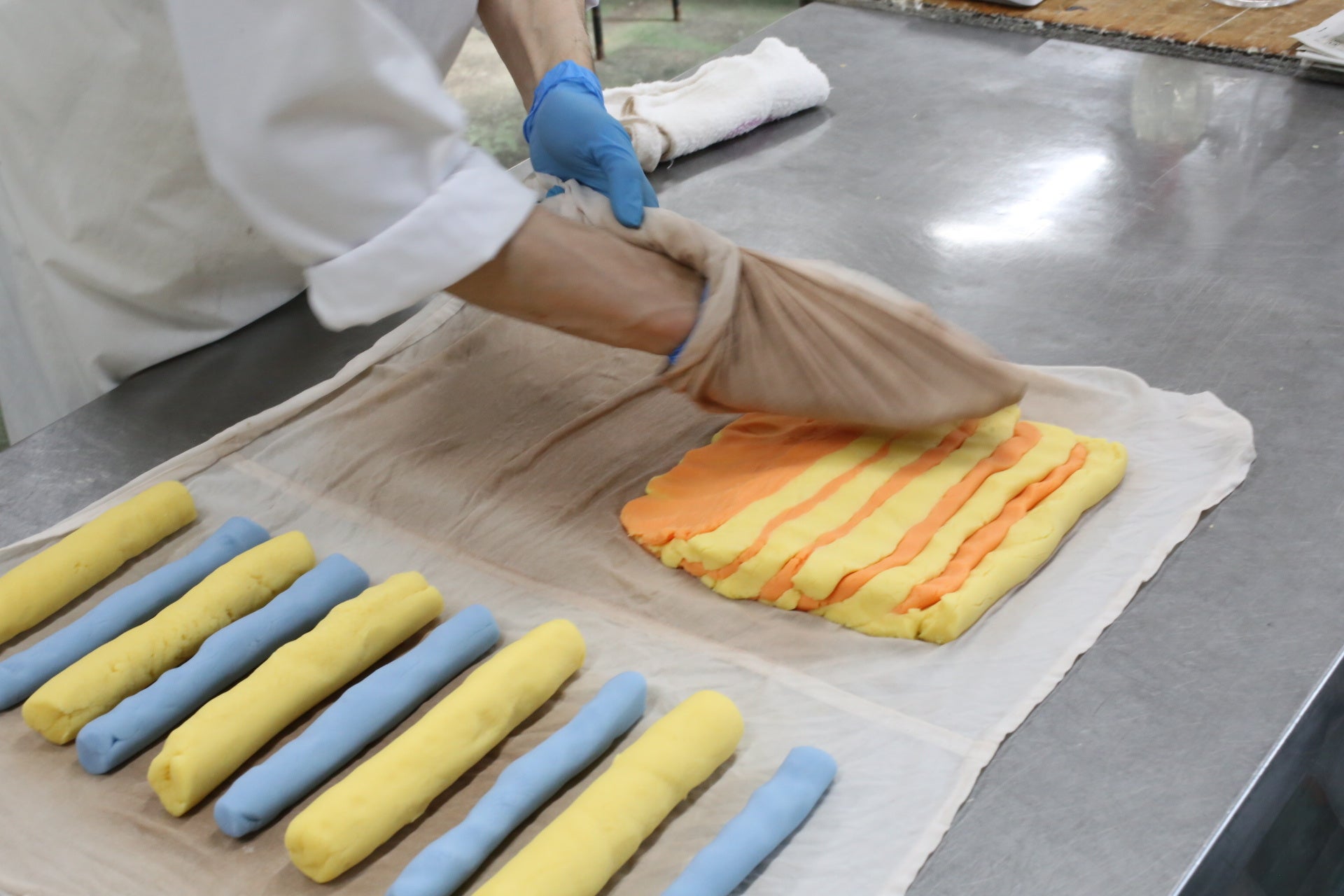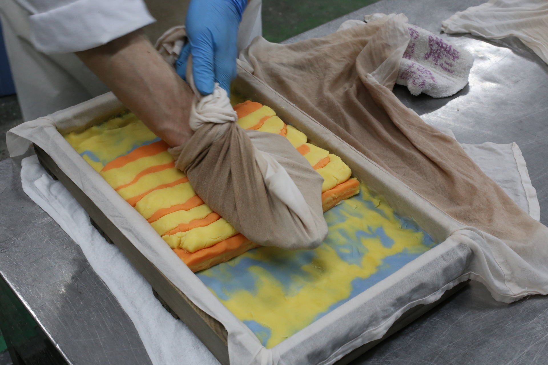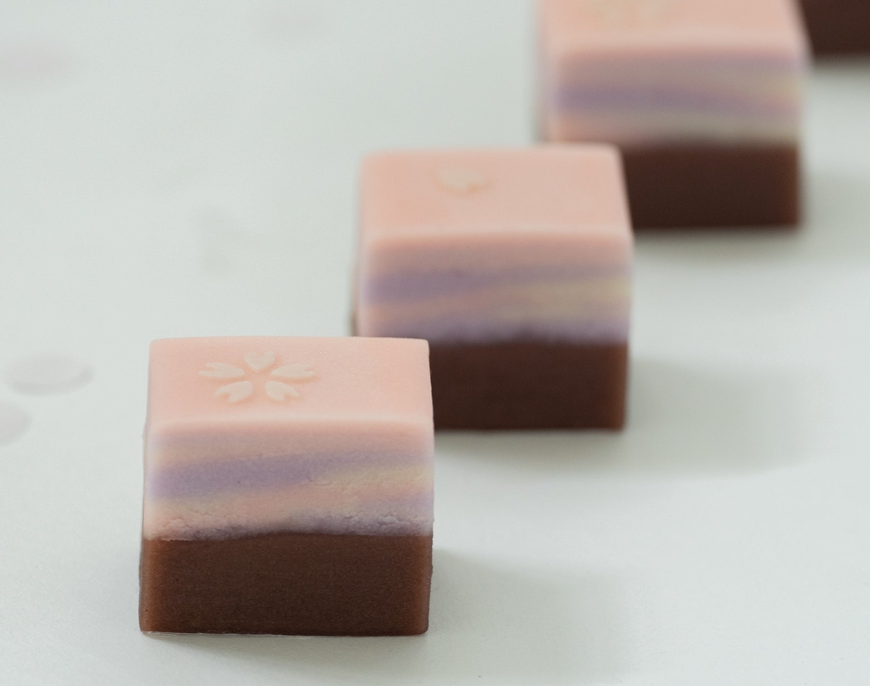 また御題菓の制作は、当店の伝統技法〈しののめ造り〉を伝える重要な機会でもあります。熱い餡を何層にも重ね、職人が手で押し固めるこの技法は、繊細な色のにじみや曖昧な境目といった“人の手の表情”を引き出します。御題菓は、この技法の魅力を最も活かせる場であり、多くの方に知っていただきたい三英堂の財産です。