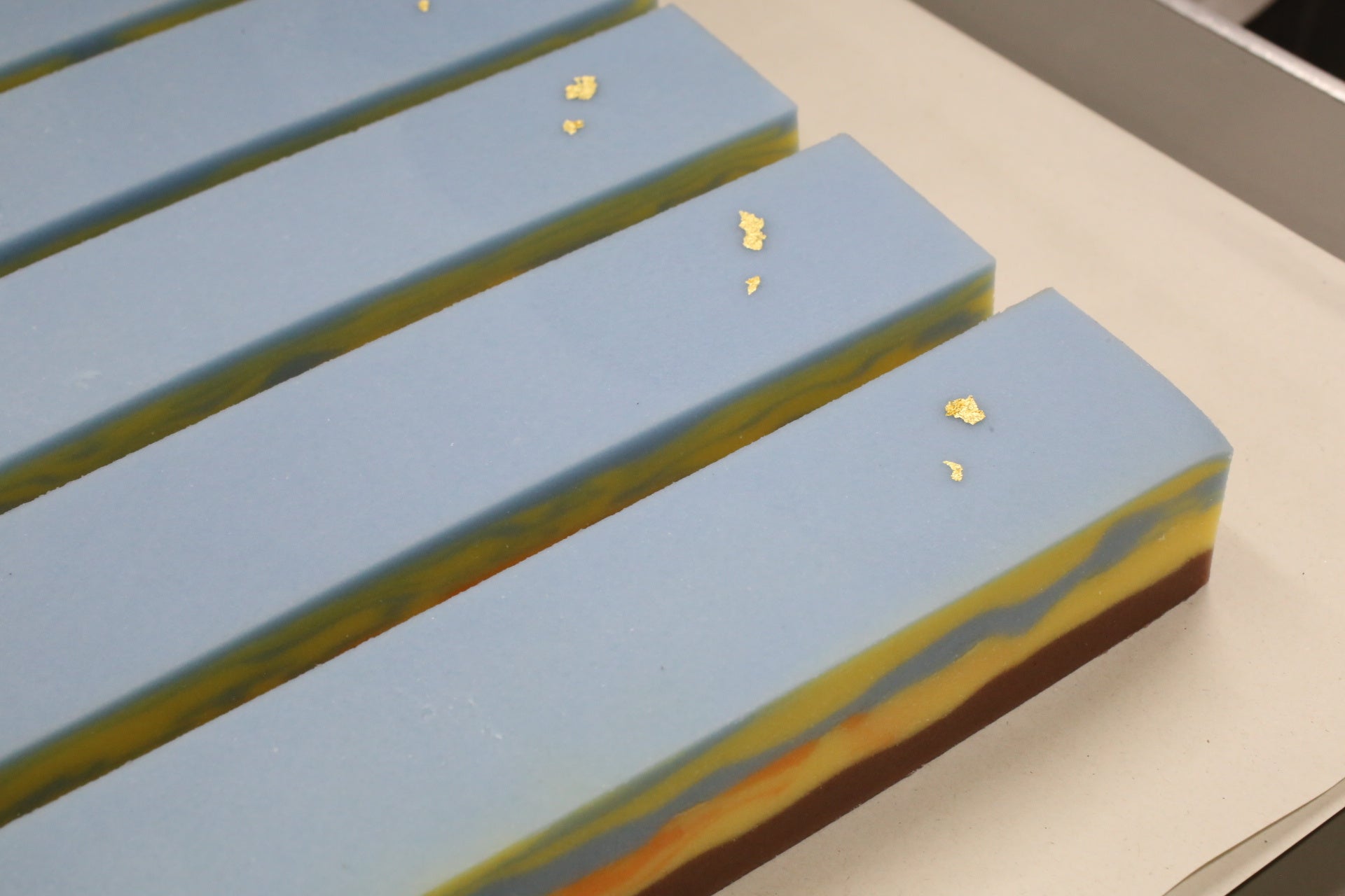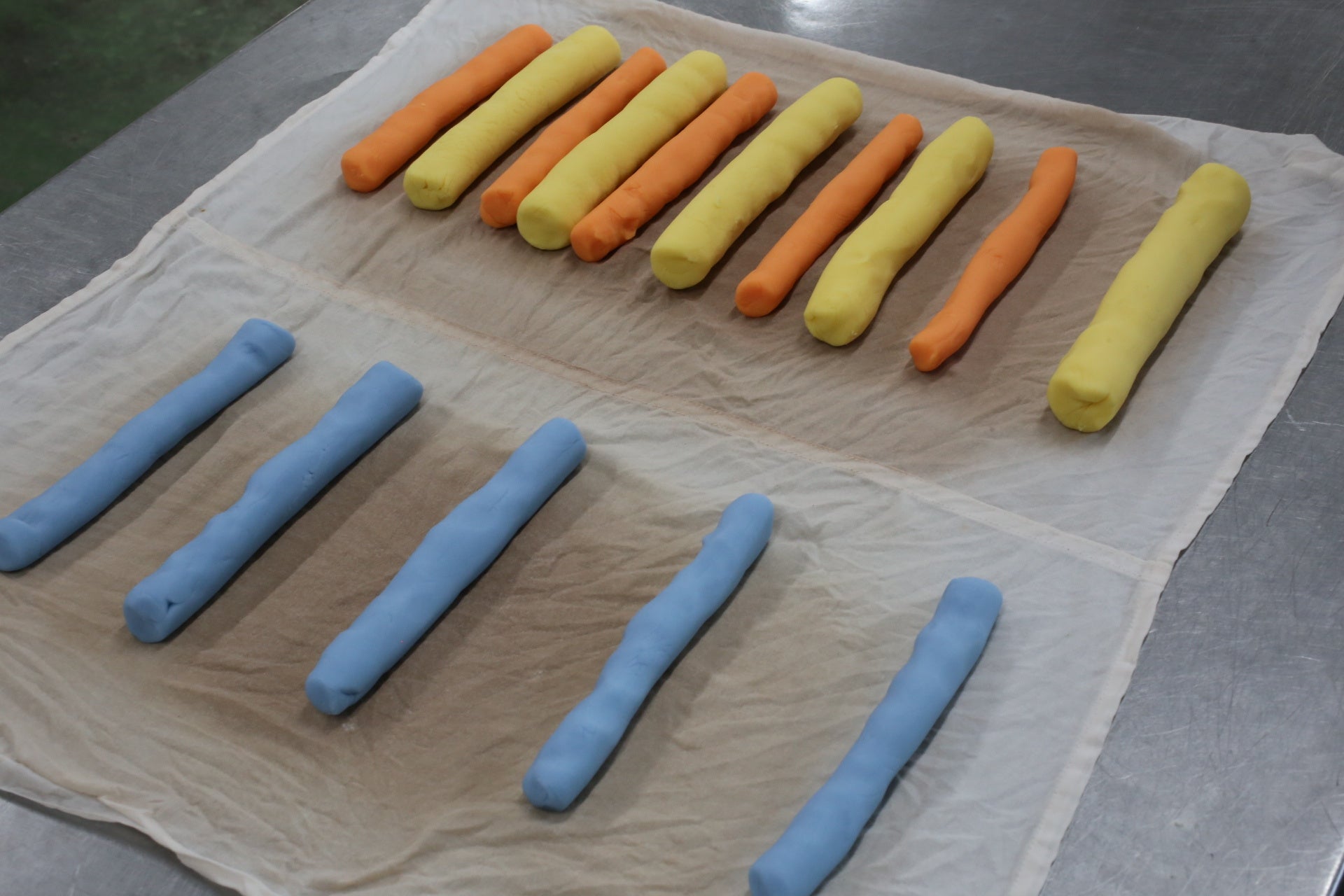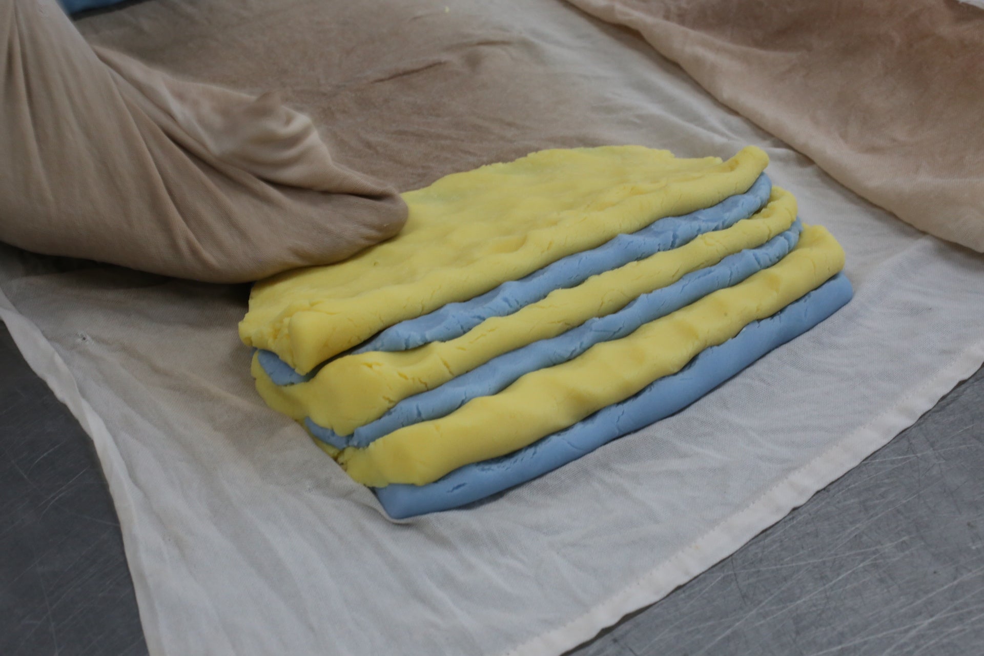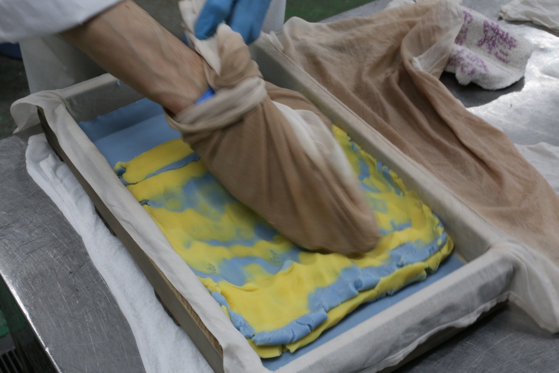 また御題菓の制作は、当店の伝統技法〈しののめ造り〉を伝える重要な機会でもあります。熱い餡を何層にも重ね、職人が手で押し固めるこの技法は、繊細な色のにじみや曖昧な境目といった“人の手の表情”を引き出します。御題菓は、この技法の魅力を最も活かせる場であり、多くの方に知っていただきたい三英堂の財産です。
