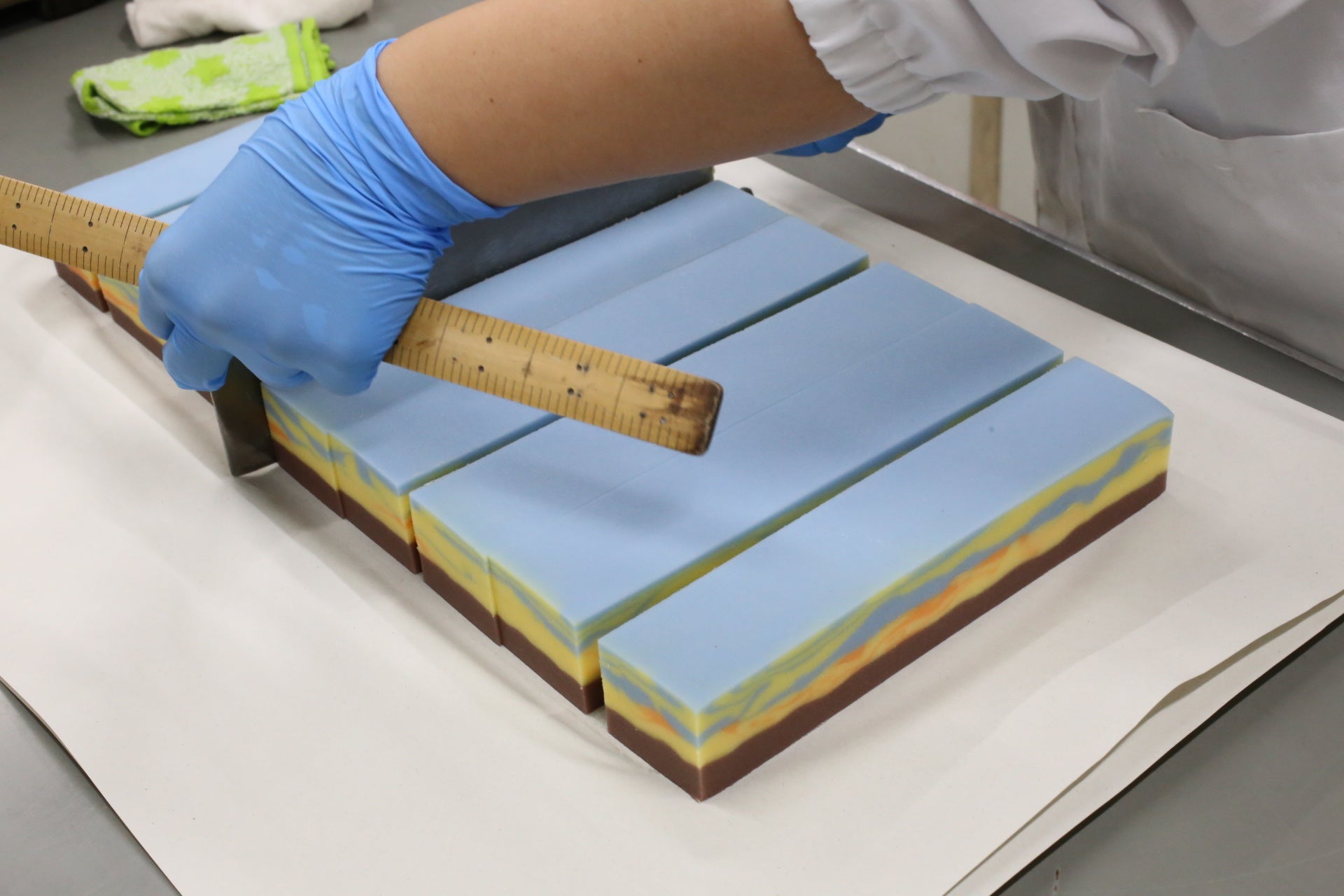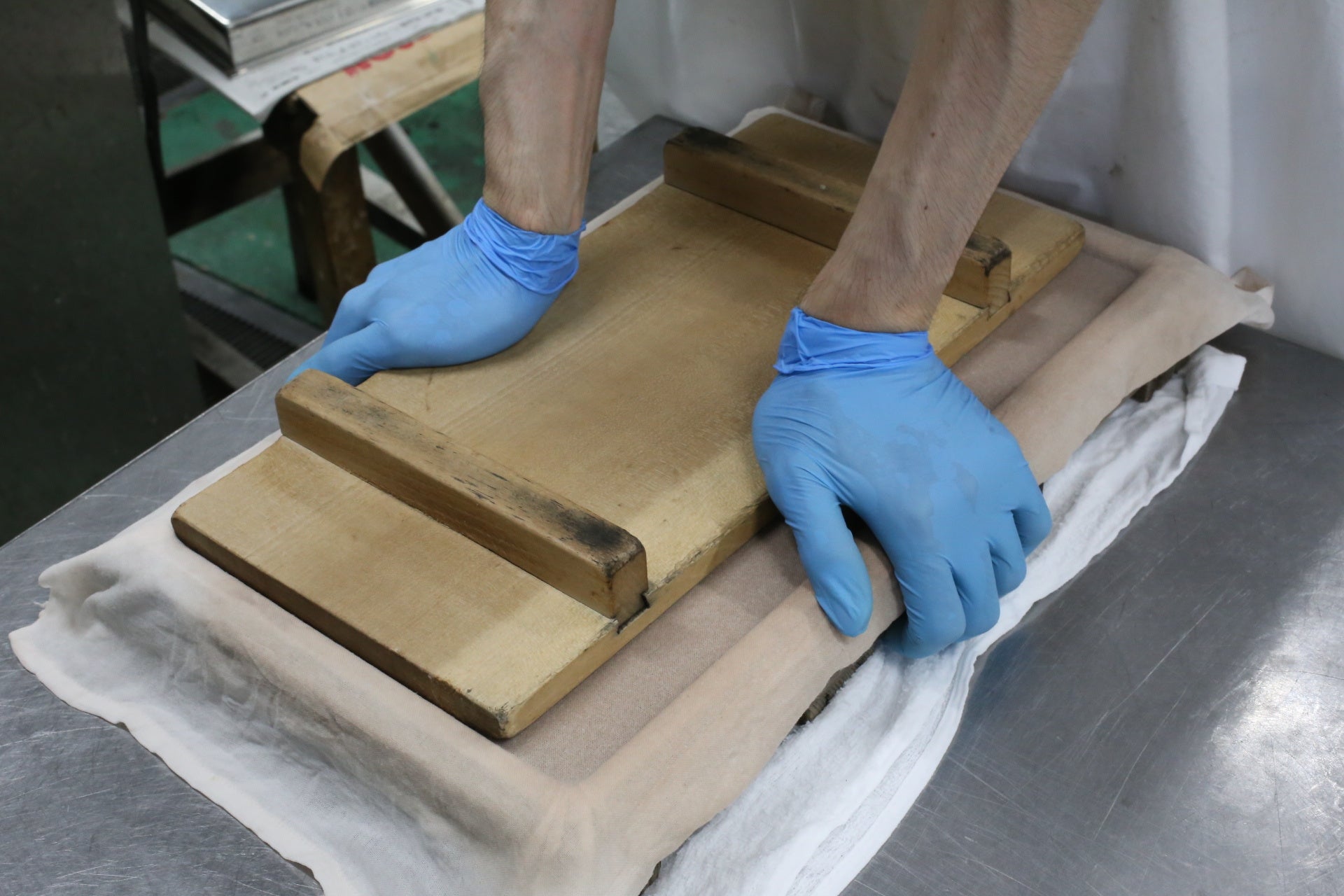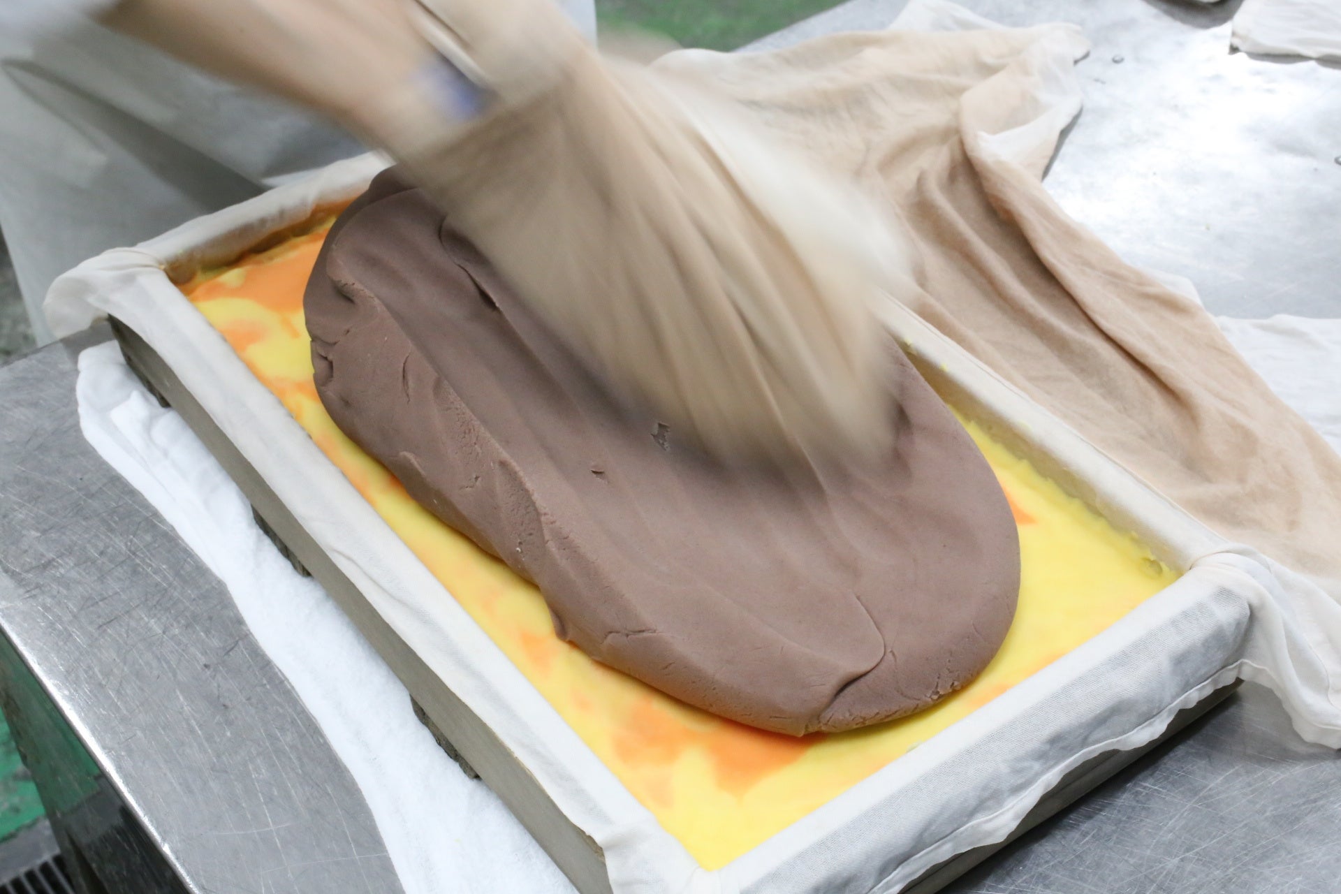 〈しののめ造り〉とは、熟練職人が熱いうちに練った餡を、羊羹舟と呼ばれる木枠に何層にも押し重ね、手でしっかりと固めて造形する、三英堂に伝わる伝統技法です。