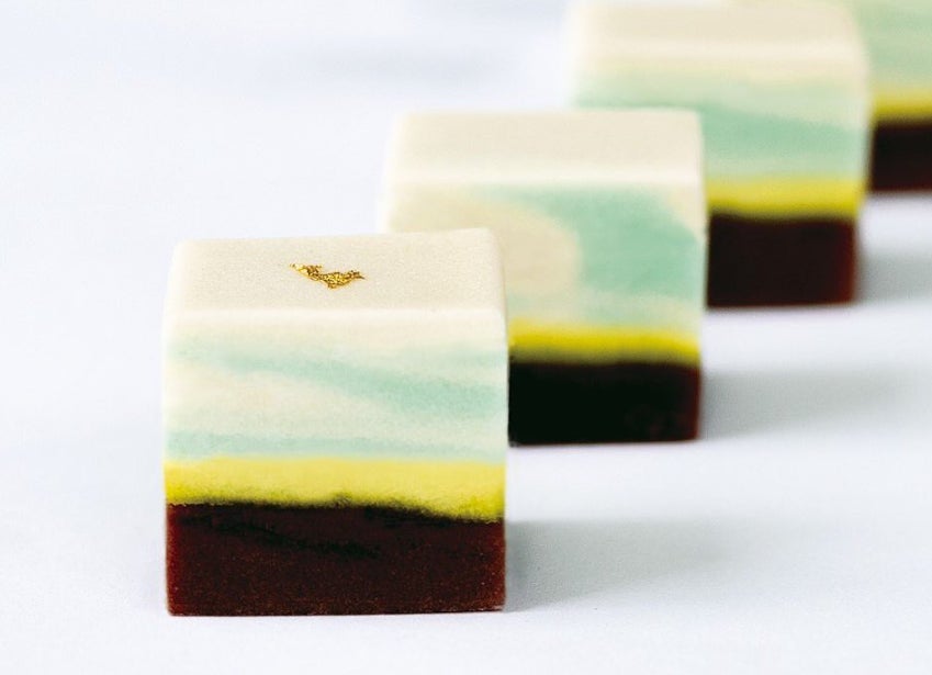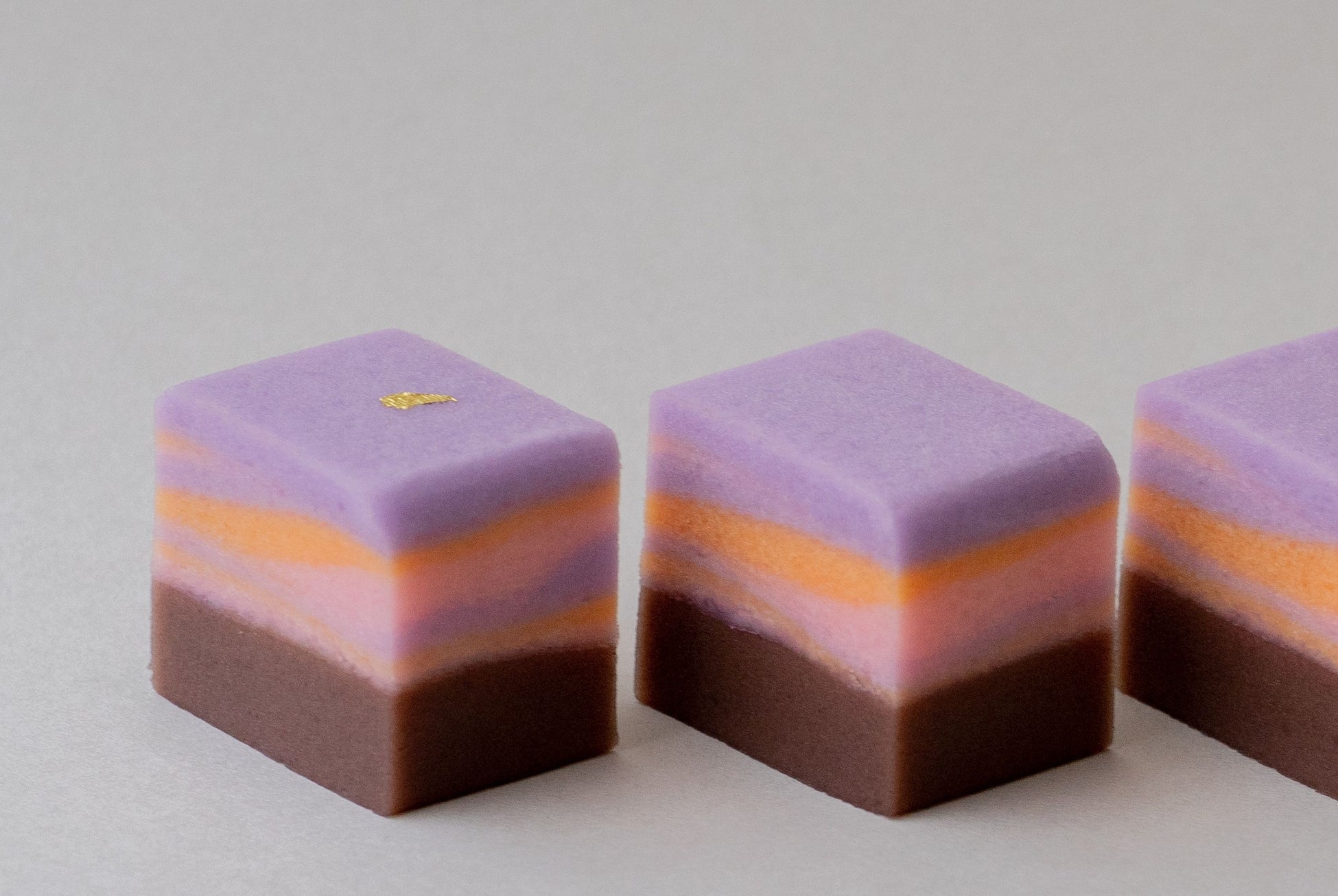 菓子の意匠は、夜が明ける直前の曖昧で美しい「色の重なり」を、三英堂伝統の技法〈しののめ造り〉によって表現しております。複数色の餡を層にして木枠で押し固め、ひとつひとつ丁寧に仕上げたこの逸品は、味わいとともに見た目にも時間の移ろいを感じていただけます。