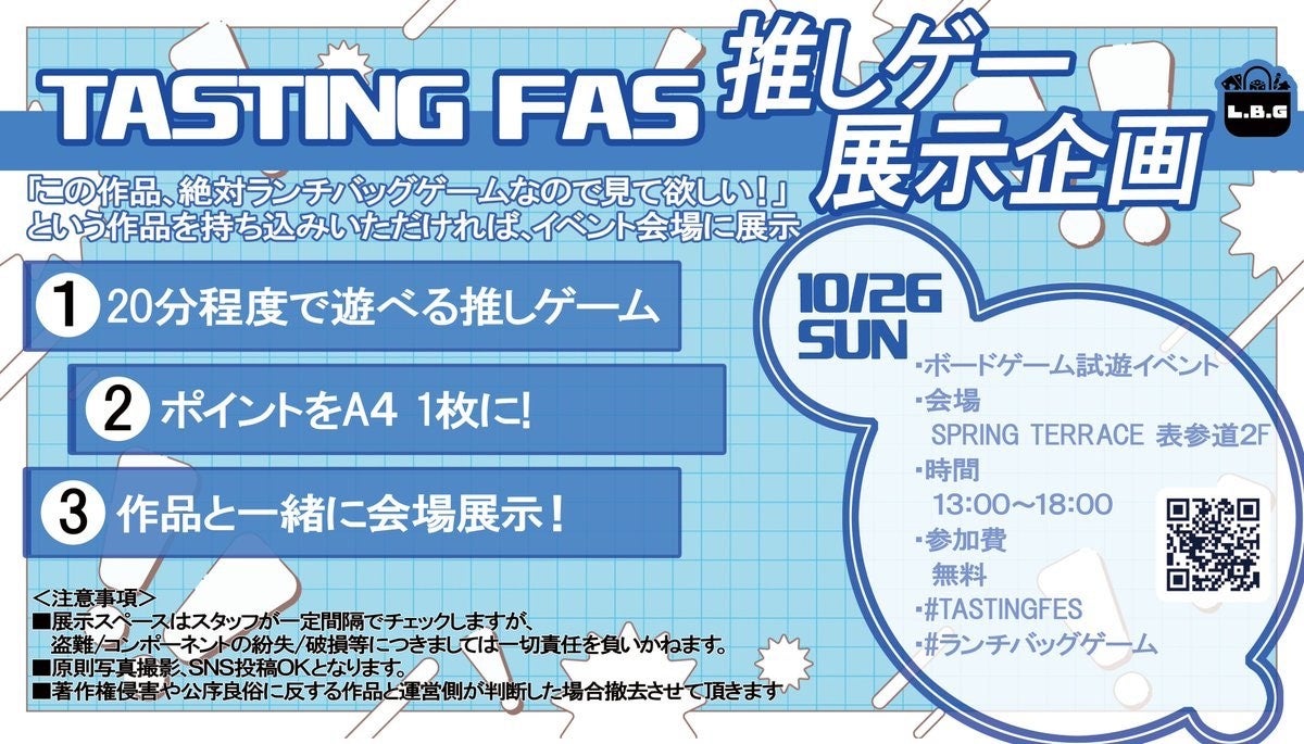 LUNCH BAG GAMESは、2025年10月26日(日)にボードゲーム試遊イベント「TASTING FES」をSPRING TERRACE 表参道2Fで開催します。ランチバッグサイズの小型ボードゲームに焦点を当てた本イベントは参加費は無料で、どなたでも気軽にさまざまなボードゲームを体験できます。20分程度で遊べる手軽なゲームを中心に、参加者が「推しゲーム」を持ち寄り展示する企画も実施します。