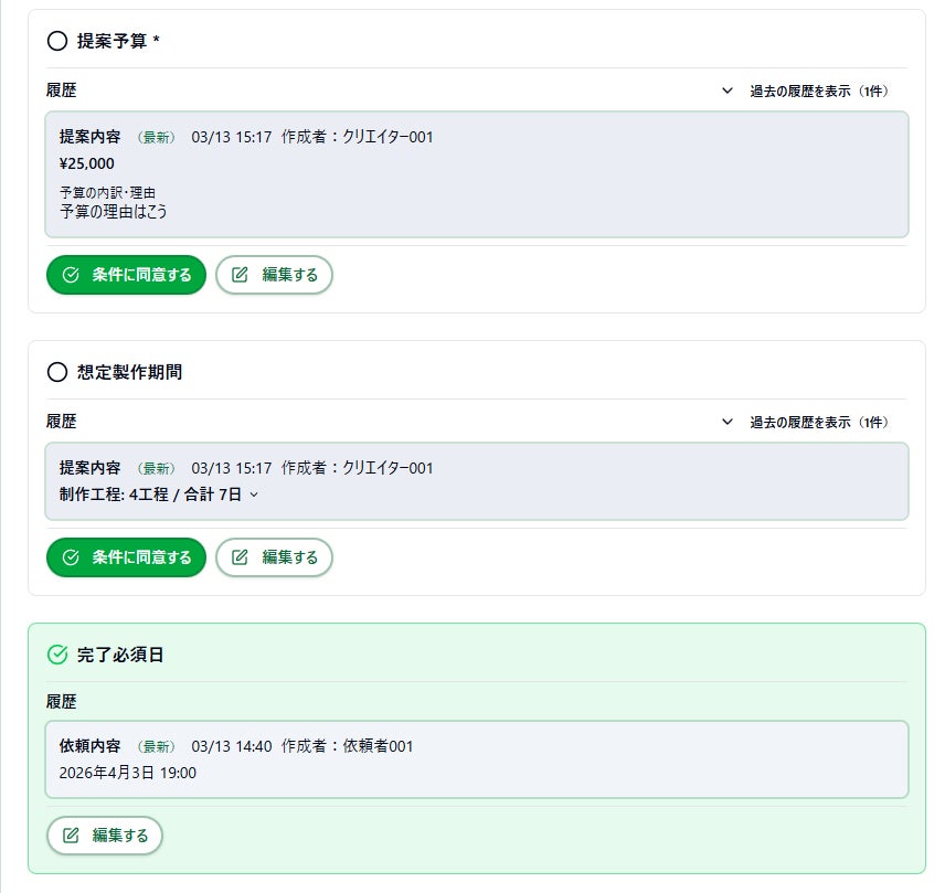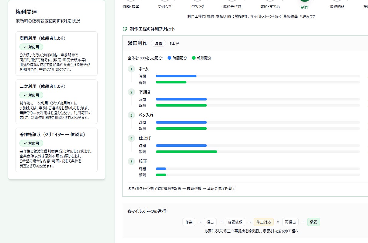 クリエイターごとに設定された工程・料金体系をベースに、スムーズな制作進行を実現します。