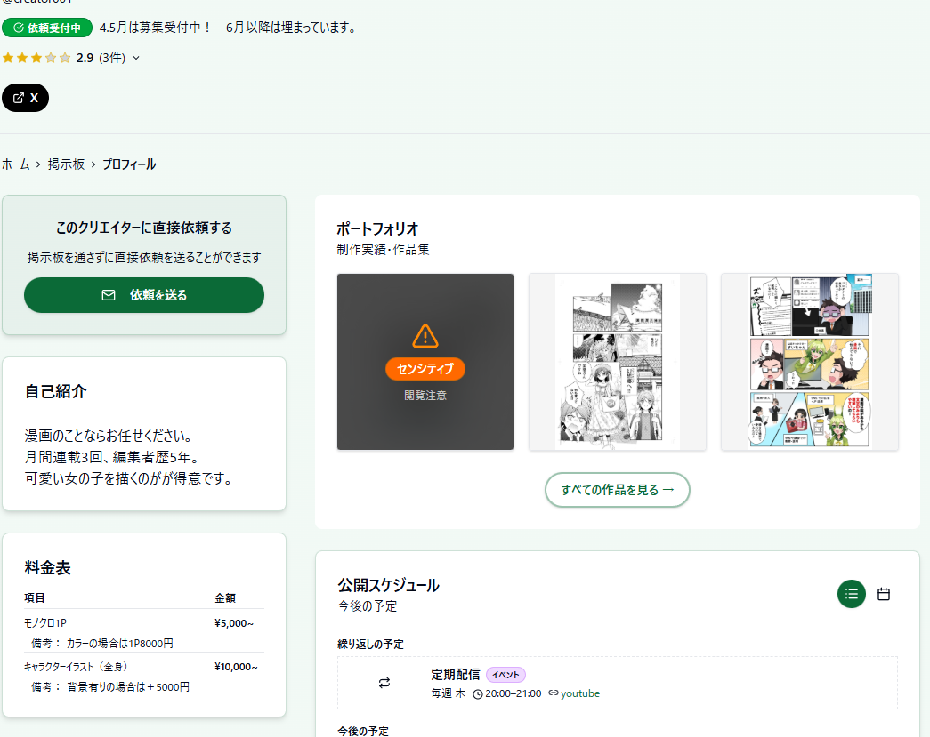 また、クリエイターのプロフィールページから、掲示板を介さない「直接依頼」にも対応しています。