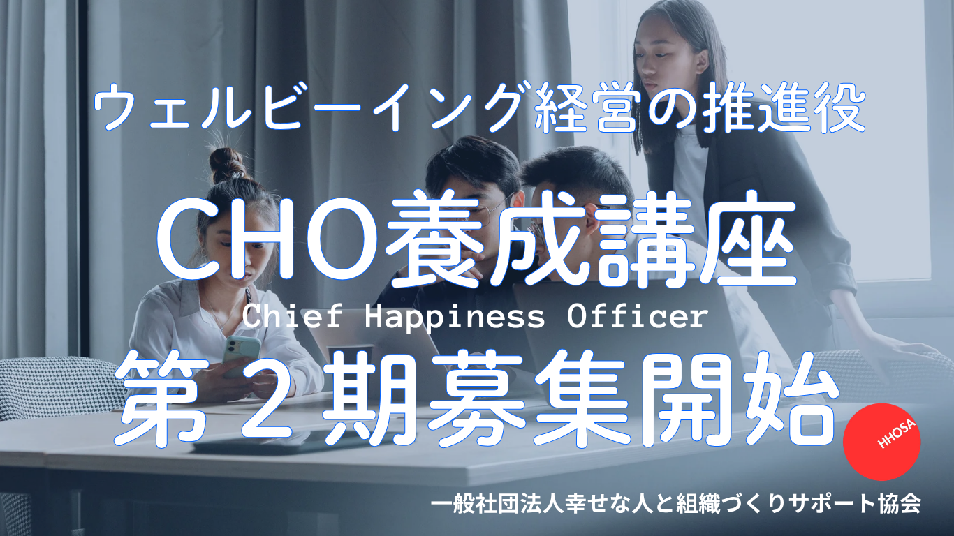 一般社団法人幸せな人と組織づくりサポート協会は、企業のウェルビーイング経営を推進する専門人材「CHO(Chief Happiness Officer)」を育成する「CHO養成講座」第2期生の募集を開始しました。