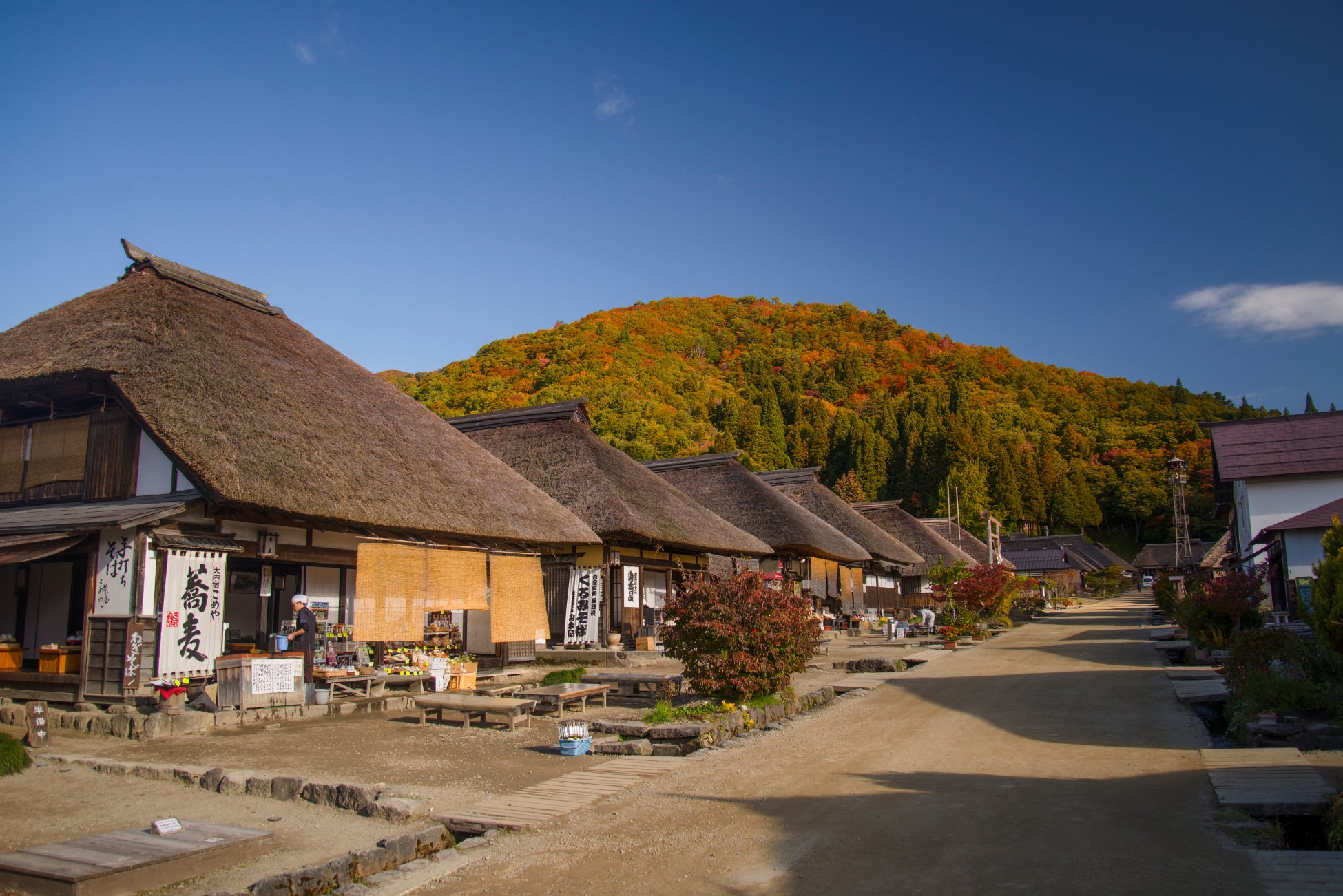 会津西街道の宿場町として栄えた大内宿。人々が助け合いながら、強く美しい暮らしの象徴として茅葺屋根の家並みが続きます。茅葺職人による普段は見られない茅葺練習場の案内や実際に茅葺体験をしていただけます。