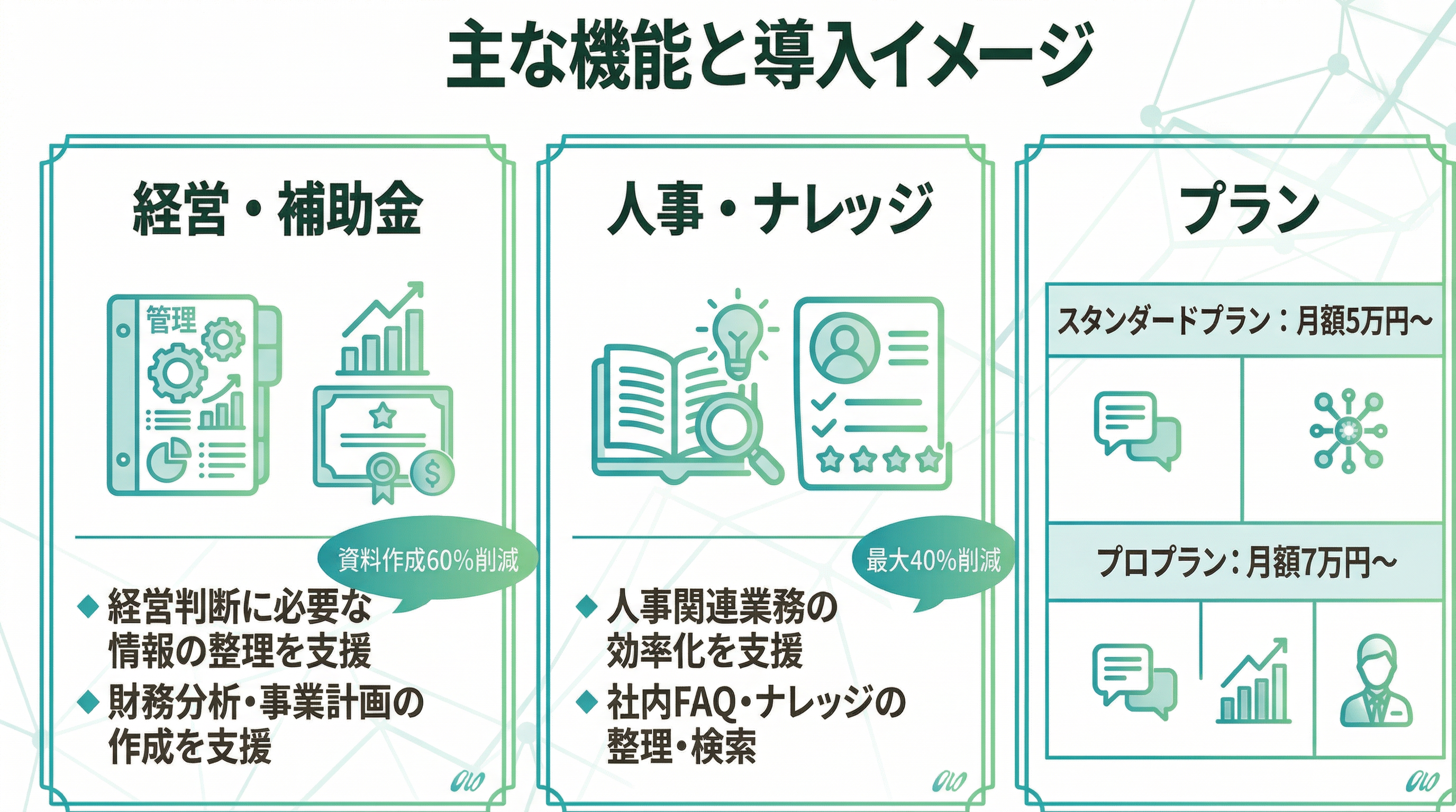 補助金・助成金活用、事業計画作成、財務分析、営業支援、採用支援、社内ナレッジ活用までを一体で支援し、AI導入を“業務効率化”で終わらせず、“成果創出”につなげる伴走型AIとして提供します。