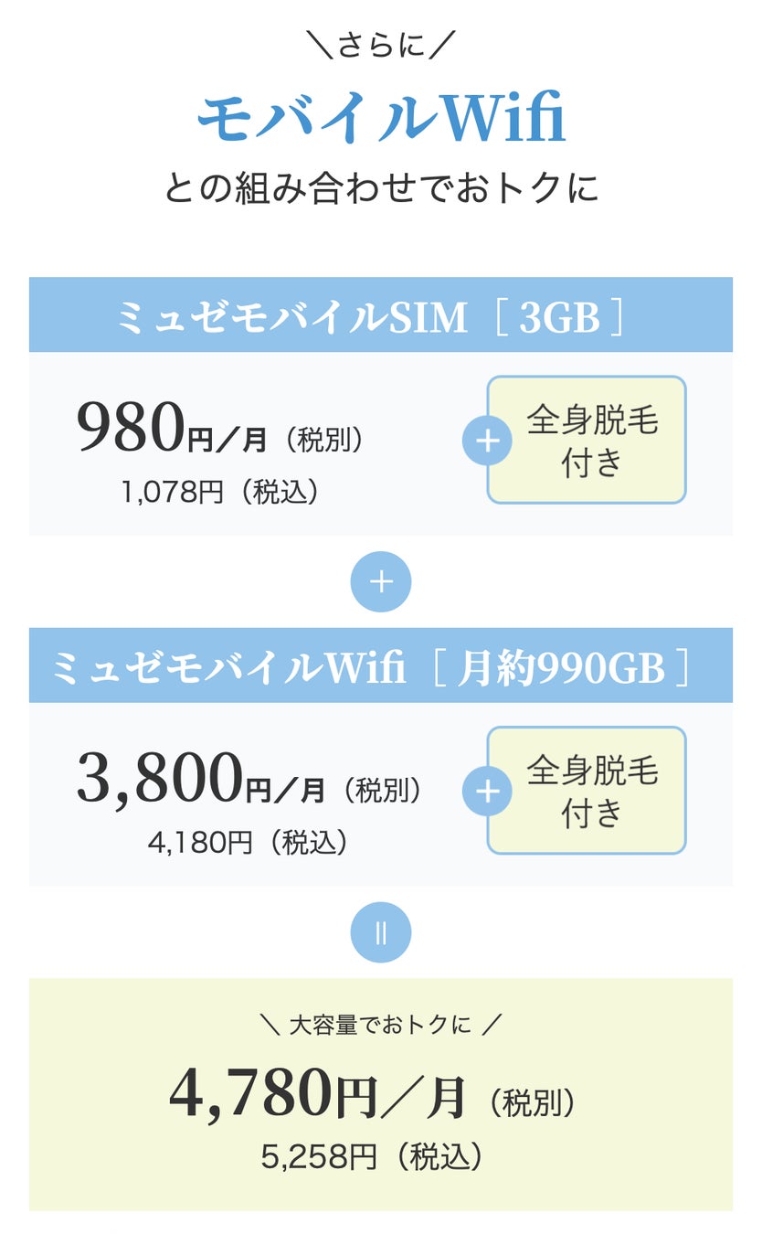 「ミュゼモバイル」は、「ミュゼモバイル SIM」と「ミュゼモバイル Wi-Fi」の2つのサービスプランから選択できます。「ミュゼモバイル SIM」では、ミュゼの全身脱毛1回がセット*になった契約プランを100円(税抜)からご用意。全国の「どこでもミュゼ」登録店舗(2025年8月現在、加盟店登録285店舗)にて全身脱毛1回をご利用いただけます。