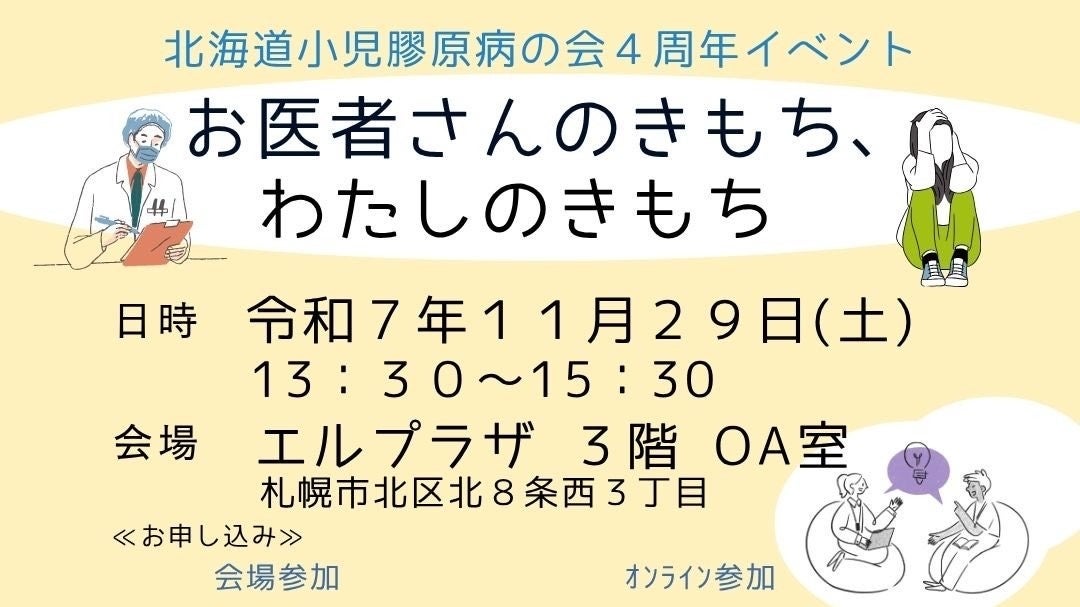 一般社団法人膠原病PR協会ミライ(代表理事:下條 真矢、所在地:東京都渋谷区、2025年7月3日設立)は、2025年11月29日(土)、札幌市エルプラザにて開催された北海道小児膠原病の会(代表:さくま しほこ、2021年12月25日設立、以下「同会」)主催の4周年記念イベント『お医者さんのきもち、わたしのきもち』に、協力団体として参加しました。