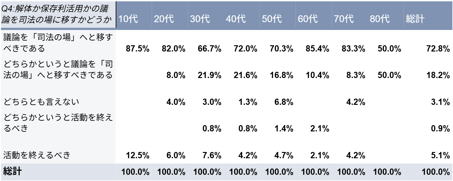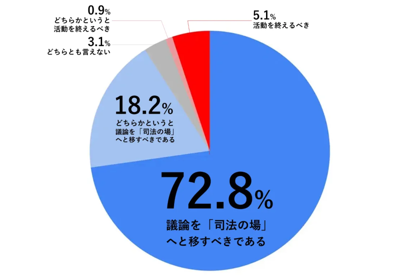 アンケートでは、すべての年代において約9割という高い割合で、活動を司法の場へと移行することに対して肯定的な意見が示されました。