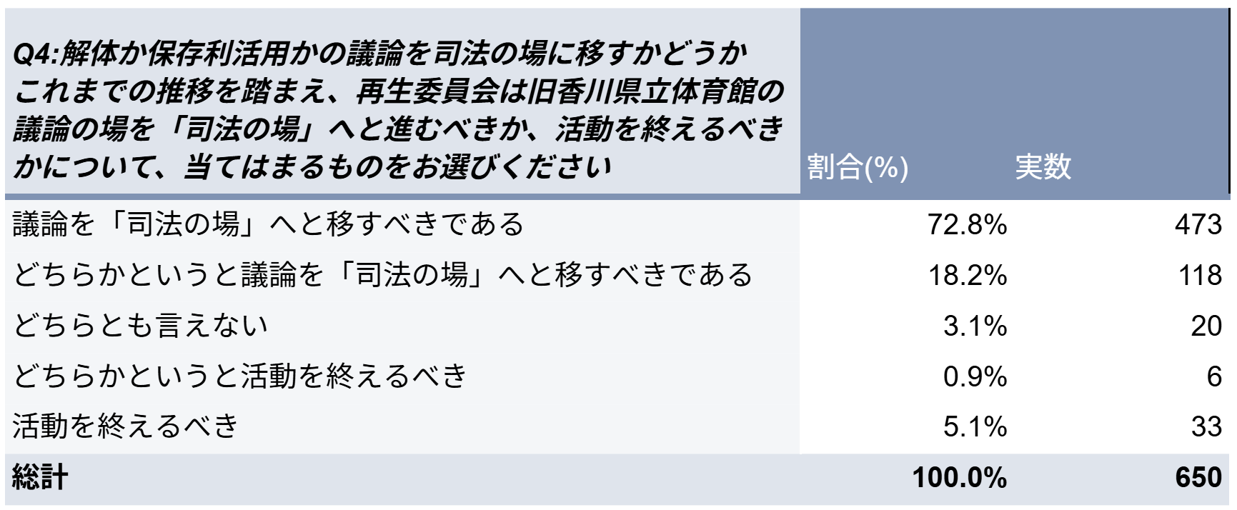 保存再生活動の議論場を司法へ移行するかのアンケートに650件ものご意見が寄せられ、約9割が「司法の場への移行」に対して肯定的。香川県内からの回答も約半数を占め、県民の高い関心が明らかに