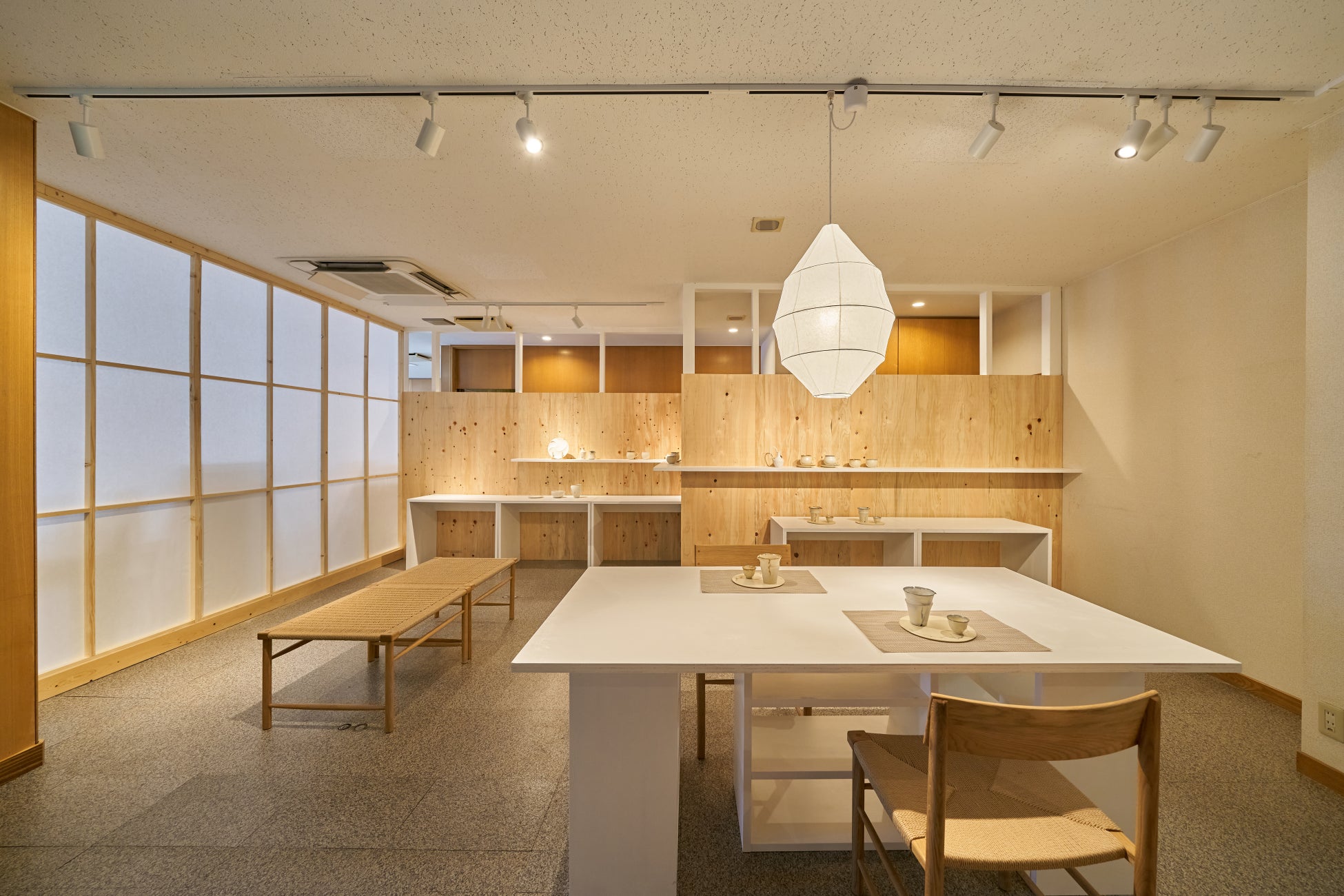 シンプルでありながら洗練された空間が、器の造形と白の美しさを際立たせます。