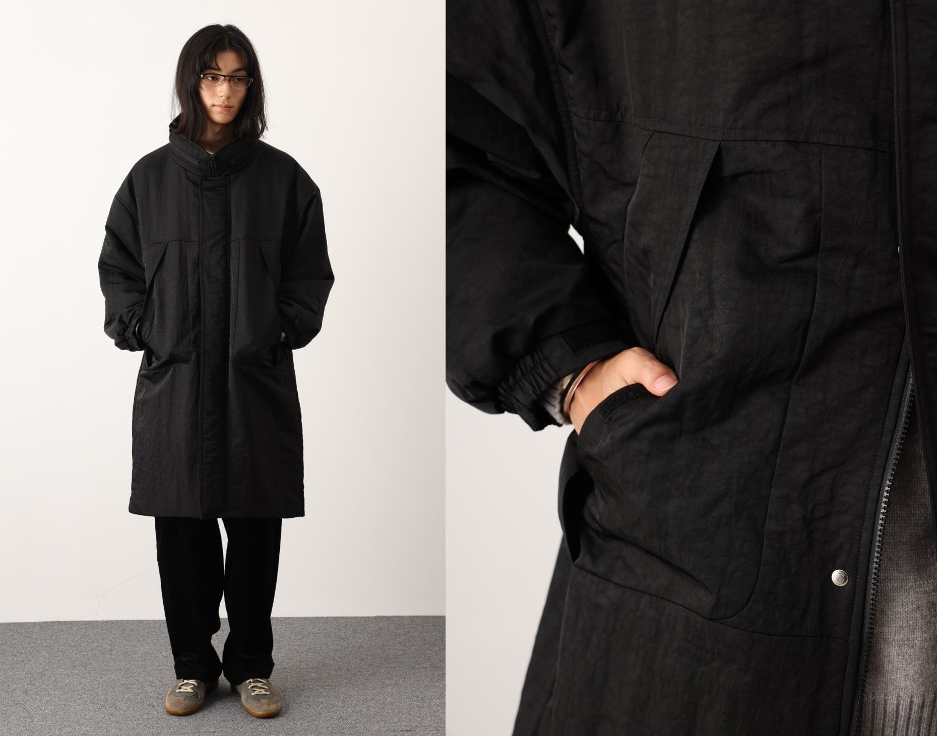 ウエストには共地のベルトを配し、シルエットにメリハリをプラス。トレンドのダブルデザインで、オーバーサイズに着こなすのがおすすめです。チンウォーマー付きで、スタンドカラーとしても着用可能。さらに、袖口のボタン位置を調整することで、袖のボリューム感をアレンジできます。