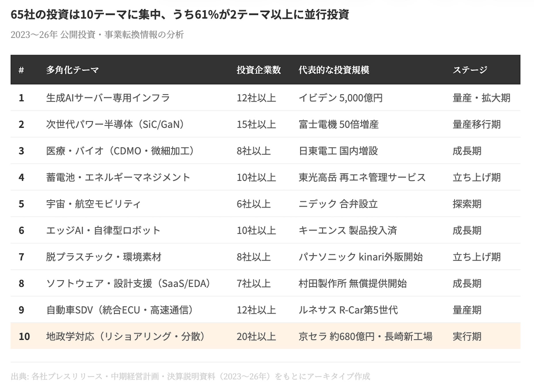 アーキタイプ株式会社が公開情報に基づき65社を横断分析。10の投資テーマと3つの分岐点を特定