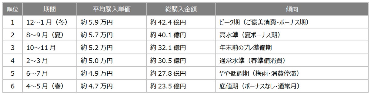 分析の結果、ホリデーシーズン(12月〜1月)にブランド購買が大きく増加する傾向が明らかになりました。特にバッグ・時計・ジュエリー・財布といった高単価アイテムの購入比率と平均購入額が上昇。また、12月〜1月の購入額は年間を通して最も多く、最も低い4〜5月と比較して約1.8倍の約42.4億円、また1回あたりの平均購入額も約1.25倍の約59,000円と、年末のボーナスや新年のスタートに合わせた「自分を甘やかすご褒美消費」が多くなることが予想できます。