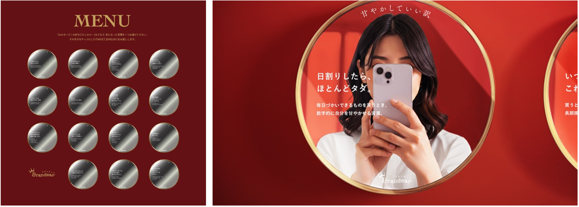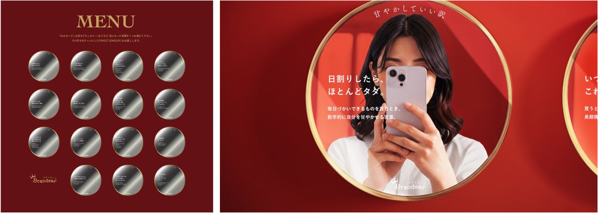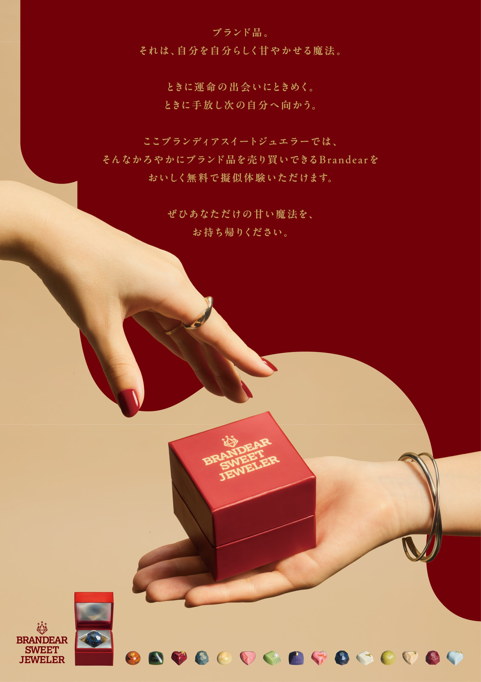 選んだ「甘やかしていい訳」を美味しく再現した「SWEET JEWELRY」という甘い宝石チョコをお渡し。ときに運命の出会いにときめく。ときに手放し次の自分へ向かう。そんなBrandearが届ける甘いブランド体験を、気軽に味わってください。