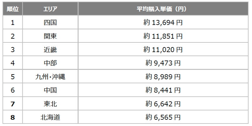 さらに、地域別に見ると意外な結果も。「日本で一番自分に甘い地域」は関東を抑えて四国がランクインする結果に。平均購入単価は約13,700円と、最下位の北海道(約6,600円)の2倍以上となり、エリアによって“自分への甘やかし方”の違いが見えてくる結果になりました。