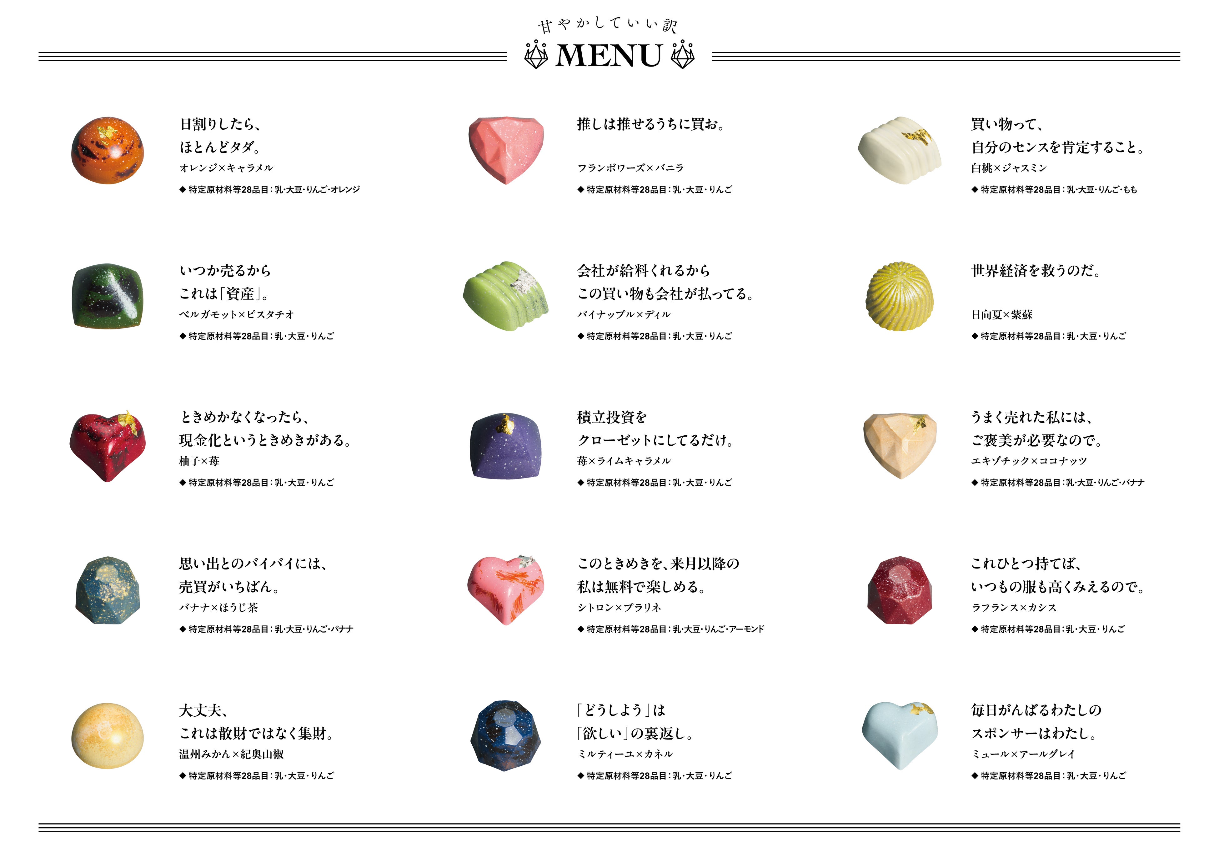 ■全15種類のブランド品にまつわる甘い言葉を味で翻訳、そのすべてを本作オリジナルに開発