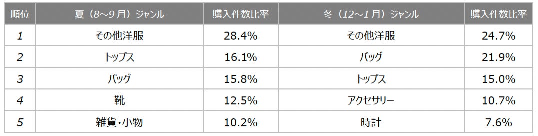 一方で、月の購入金額が2番目に多い8〜9月の夏のボーナス期には、洋服(トップス・ボトムス・ワンピースなど)の購入が多く、“実用性重視の購買”として季節によって異なる「甘やかし方」が浮かび上がりました。