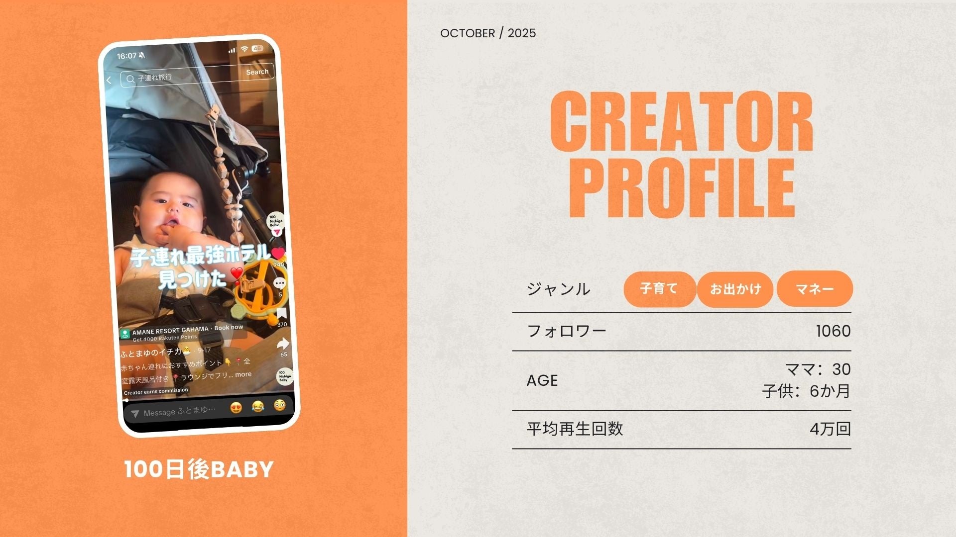 「100日後BABY」は、子育てグッズや子連れでお出かけできるスポットを中心に取材し、動画を制作・発信しています。これまでの投稿の中には、再生回数60万回を超える動画も。子育て分野に強みを持つ同メディアの加盟により、子育て世代への認知拡大が期待できます。