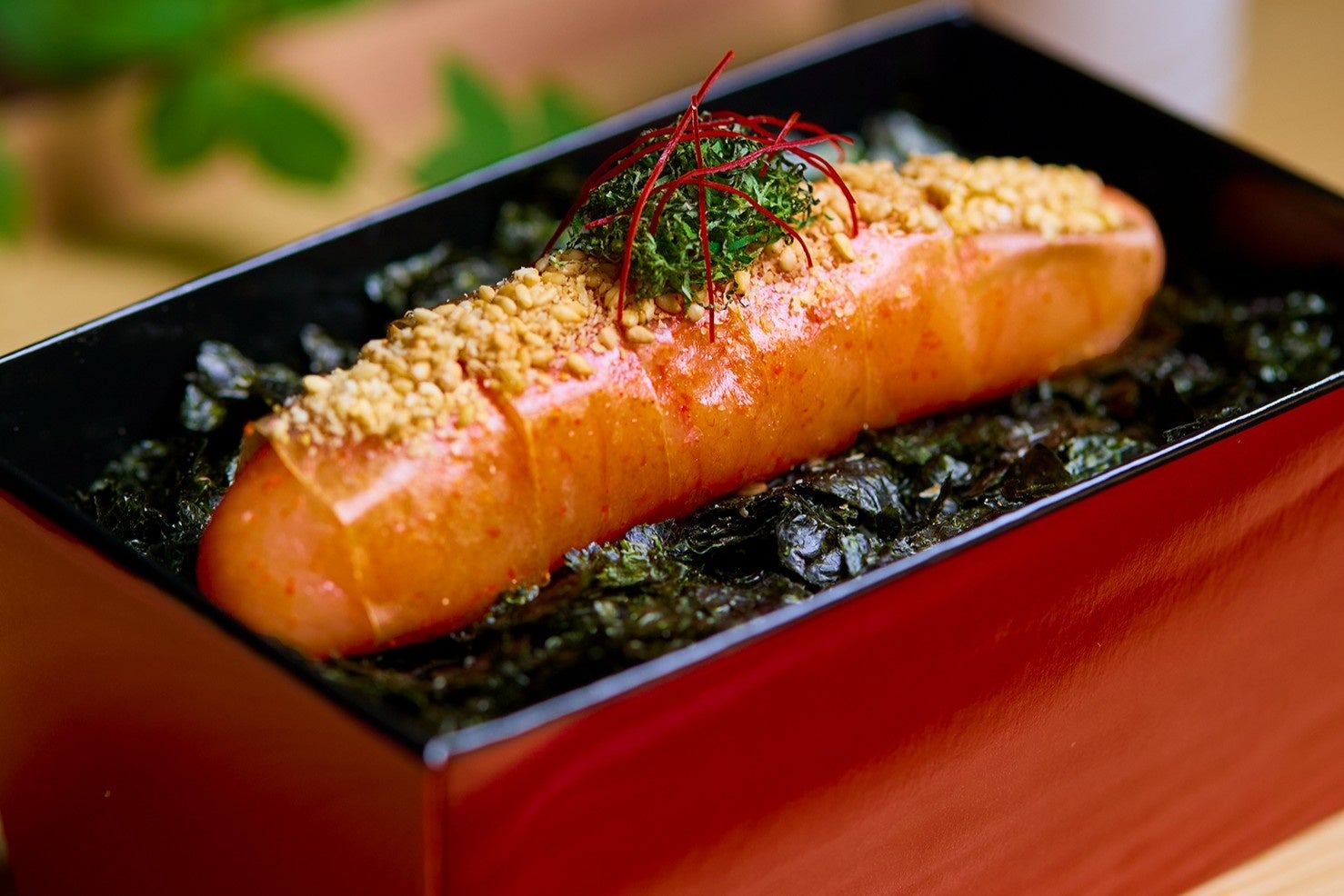 じっくり漬け込んだ昆布巻き明太子を、海苔が敷かれたごはんの上に、丸ごと1本乗せて食べる博多名物「めんたい重」。付属のたれは、少しずつかけて、味の変化をお楽しみください。催事会場でも、ひとつずつ丁寧にお作りいたします。出来立ての美味しさを、どうぞご賞味ください。