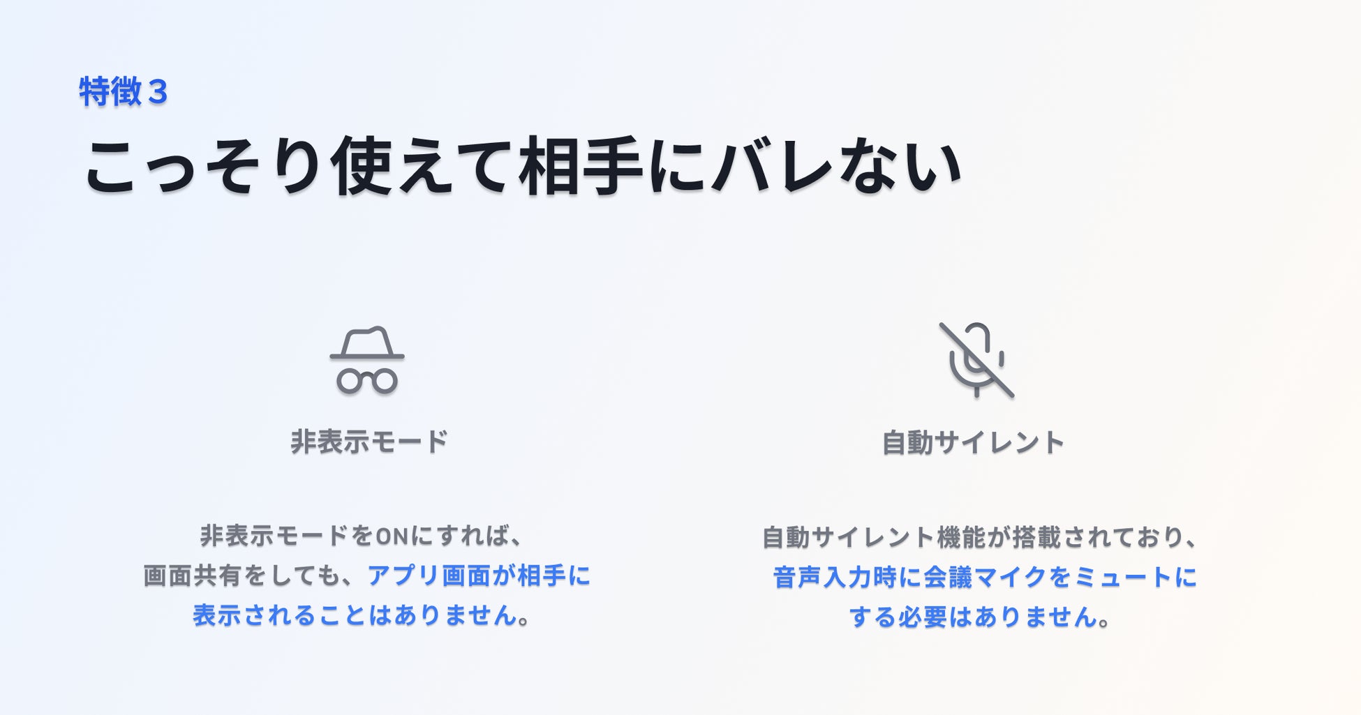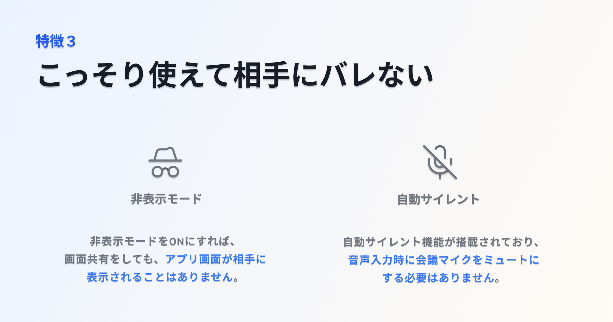 さらに自動サイレント機能により、発話支援のために音声入力を行っている間も、マイクを手動でミュートに切り替えることなく、会議相手に音声が聞こえることはありません。