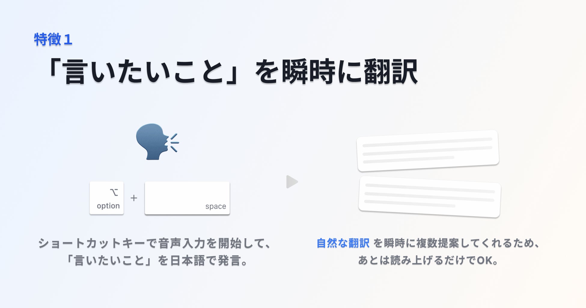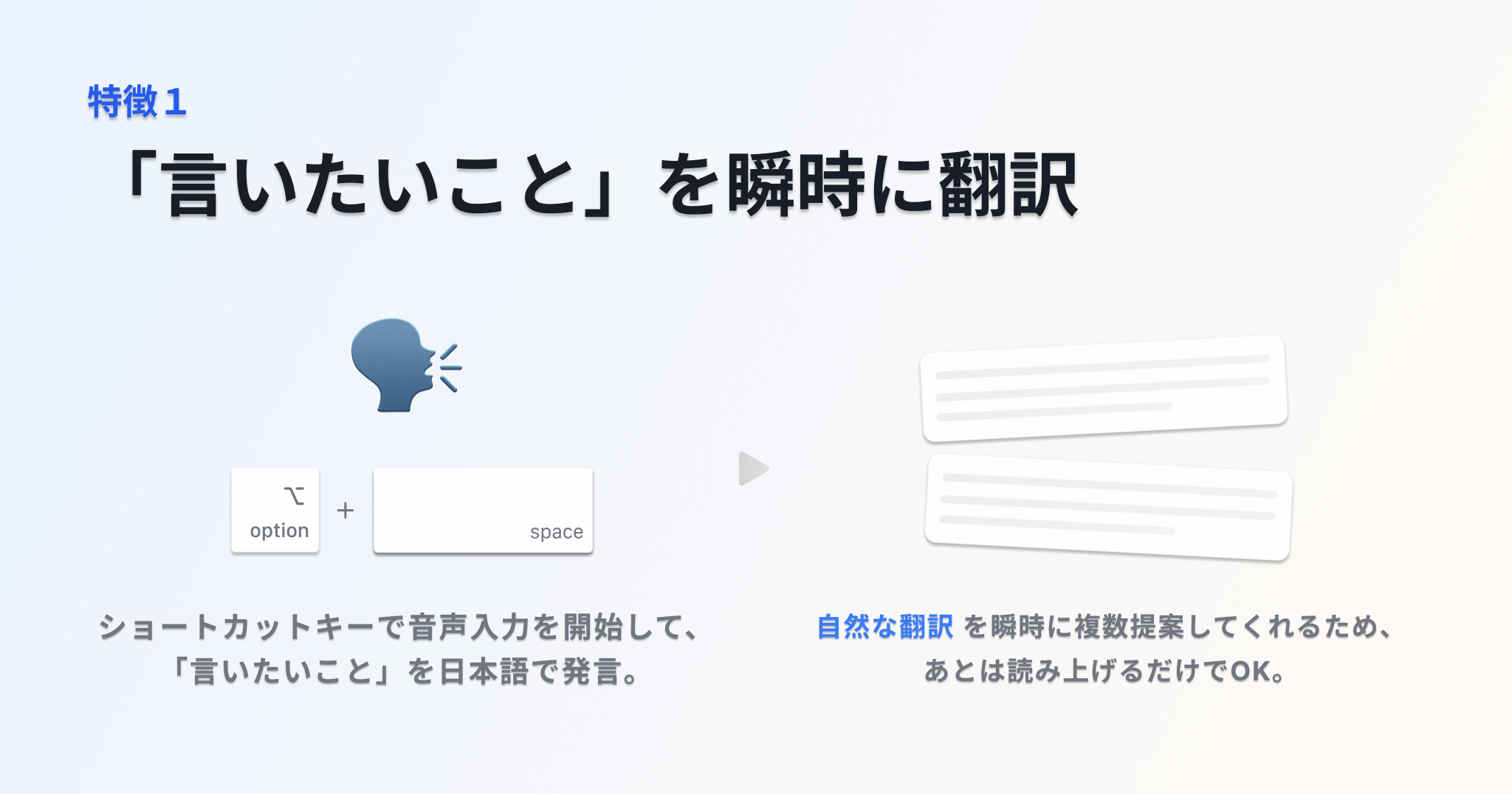 ショートカットを押すだけで、話したい内容を日本語で音声入力でき、その場で日本語→英語や他言語へ翻訳されます。