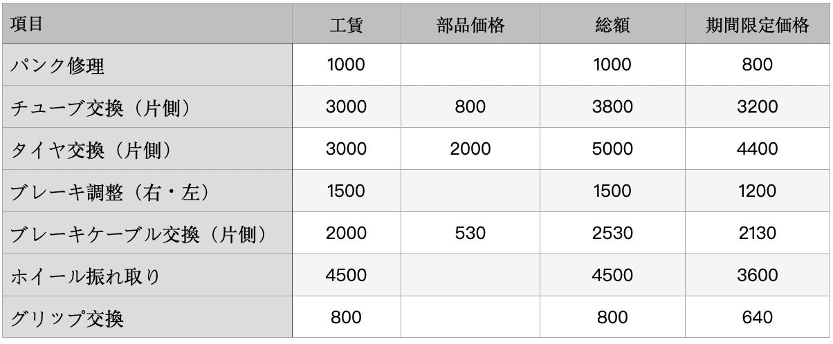 1)車輪関連:パンク、タイヤ交換、チューブ交換、ホイール振れ取り、スポーク交換、ホイール組み直しなどのタイヤ関連の修理(空気入りタイヤおよびスポーク組みホイールに限る)