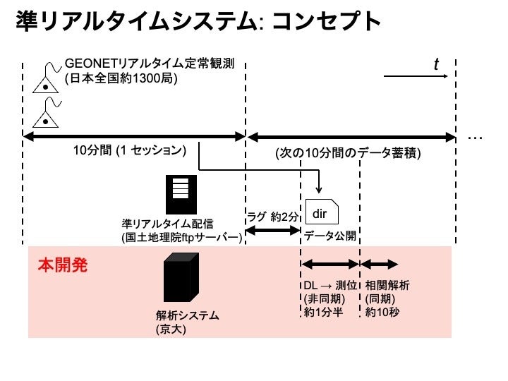 当面の課題および予定: 開発したβ版は、国土地理院運営のGEONET(準リアルタイム運用)だけでなく、リアルタイム運用可能な京都大学大学院情報学研究科物理統計学分野が保有する観測機データ(吉田キャンパス、潮岬)や、現在の共同研究先であるJR東海(東海旅客鉄道)、愛知県蒲郡市(地方自治体)、アマノ(神奈川県)、富士防災警備(東京)と連携し、今後設置する観測機(GNSS受信機)を組み合わせて解析し、その結果を共有するシステムを構築します。 共同研究先も2026年からさらに増やし、観測データの拡充を図るとともに、アラート発出システムの24時間共同検証を行う予定です。また、精度面でもリアルタイム測位の精度を向上させることが課題であり、これらの検証および課題解決を行った後に、準リアルタイムシステムの実運用を開始します。さらに、当研究室が開発したリアルタイム電離圏トモグラフィー技術や、プレスリップ相関解析から震央推定を行うアルゴリズムなども、順次この準リアルタイムシステムに組み込んでいく予定です。