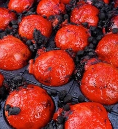 鉄板の上で赤く染まり、まるで溶岩(マグマ)のように仕上がる様子は、