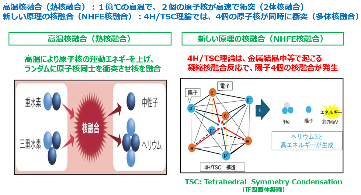 通常の核融合反応は、高温(一億度以上)が必要です。また、これらの反応を実現するため大規模な設備も必要で、設備の価格も高価(数兆円)です。ここで紹介する新しい原理の核融合は1,000℃以下でも反応するため、設備も小型化でき、放射能も検出されないため、環境に優しい未来の新エネルギーであると確信しています。
