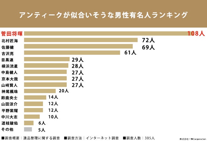 ・アンティークが似合いそうな有名人ランキング男性部門第1位は「菅田将暉さん」(108人)、第2位「北村匠海さん」(72人)、第3位「佐藤健さん」(69人)