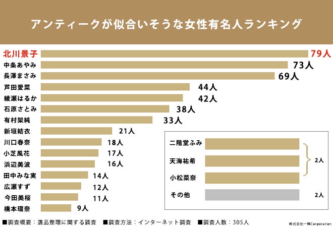 「アンティークが似合いそうな女性有名人を教えてください。(複数回答可)」と質問したところ、第1位「北川景子さん」(79人)、第2位「中条あやみさん」(73人)、第3位「長澤まさみさん」(69人)という結果になりました。