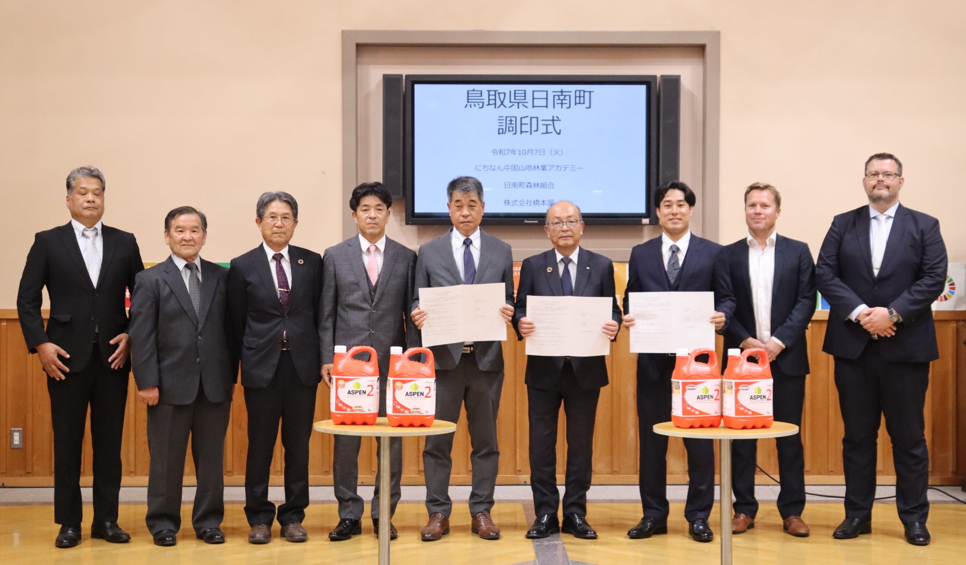 株式会社橋本屋(本社:東京都文京区、代表取締役:東原 正典)は、2025年10月7日(火)、日南町役場にて、にちなん中国山地林業アカデミー(日南町立林業アカデミー)および日南町森林組合と「ASPENの普及を通じた林業の労働環境の改善に関する連携協定」を締結し、調印式を執り行いました。本協定は、林業従事者の健康と作業環境の改善を目指す新たな取り組みであり、行政・教育機関・企業が連携する全国的にも先進的なモデルケースとなります。