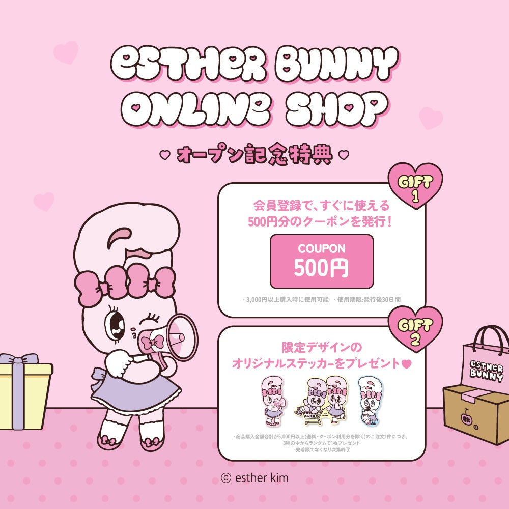 オープン記念特典として、商品購入金額合計が税込¥5,000以上(送料・クーポン利用分を除く)のご注文1件につき1枚、『エスターバニーオンラインショップ』限定デザインのステッカーをプレゼントいたします。※数に限りがございますので、なくなり次第終了となります。