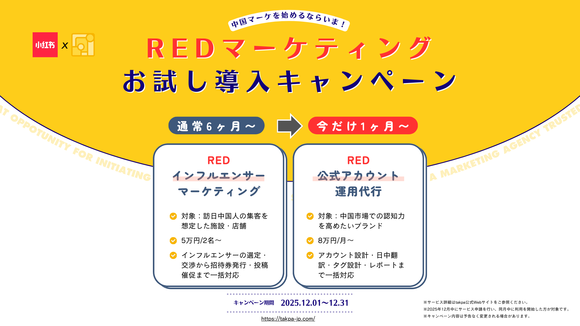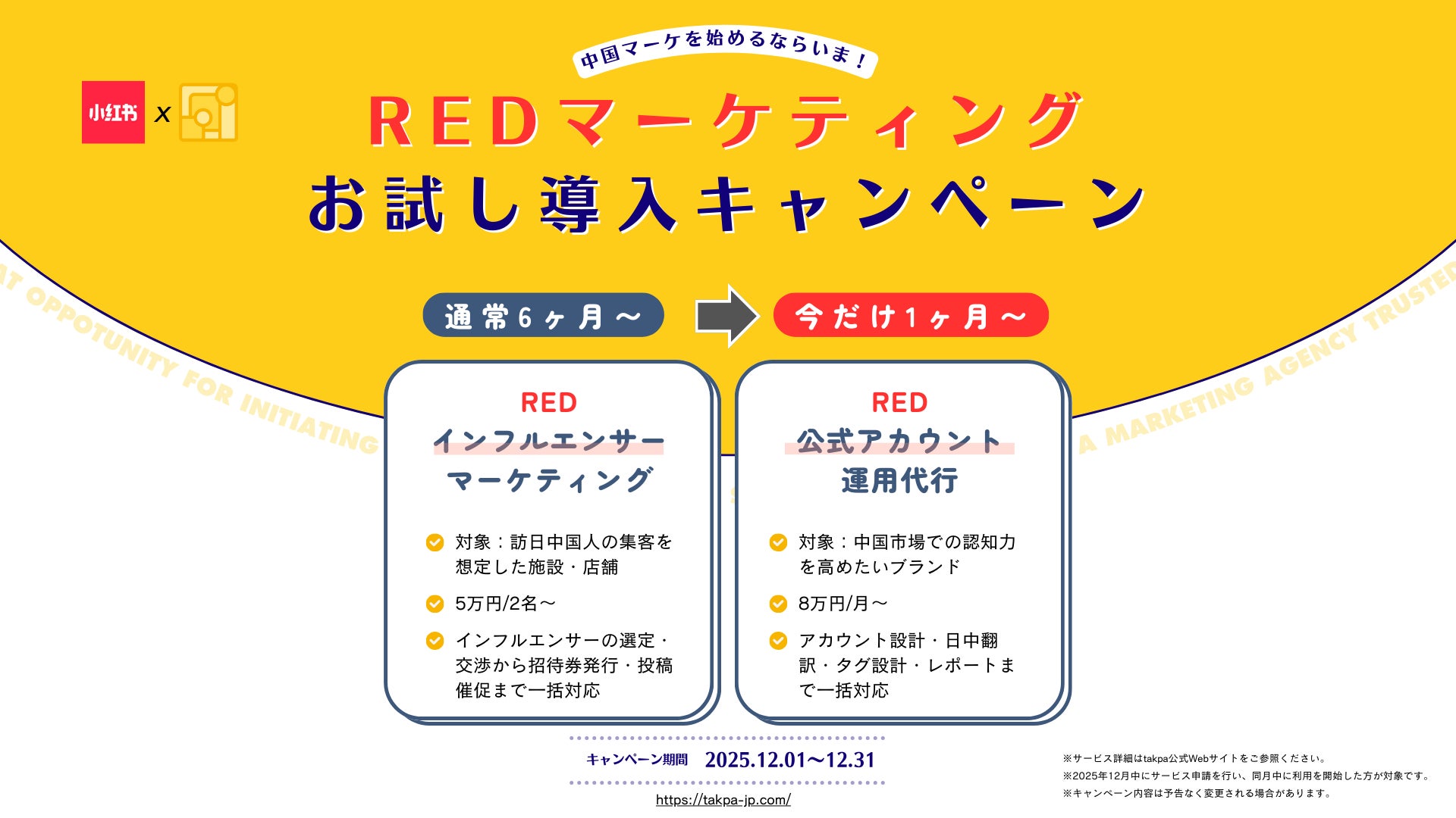 中国市場進出支援・インバウンド向けSNSマーケティングを手がけるtakpa(本社:北海道札幌市)は、訪日中国人観光客の集客支援を目的とし、2026年春節シーズンに向けた「RED(小紅書)プロモーションキャンペーン」を実施します。本キャンペーンは、北海道・東京・大阪・京都の4エリア限定で、通常6ヶ月以上の契約が必要なRED運用・インフルエンサー施策を1ヶ月の〜短期契約で試せる特別プランとして提供いたします。