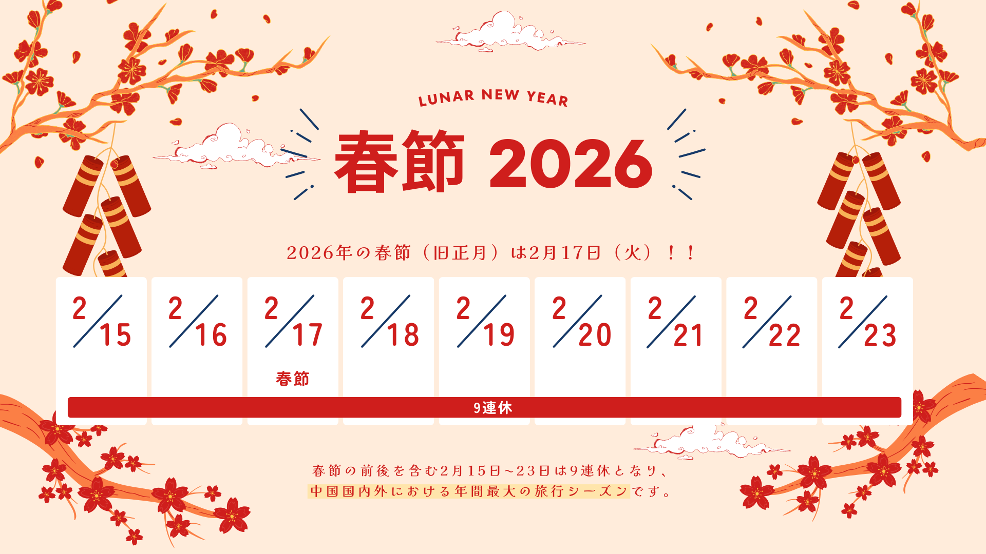 2026年の春節(旧正月)は2月17日(火)。その前後を含む2月15日〜23日の9連休は、中国国内外における年間最大の旅行シーズンです。例年、この期間には多くの中国人観光客が日本を訪れ、経済効果も大きく、観光・飲食業界にとっては非常に重要な時期です。