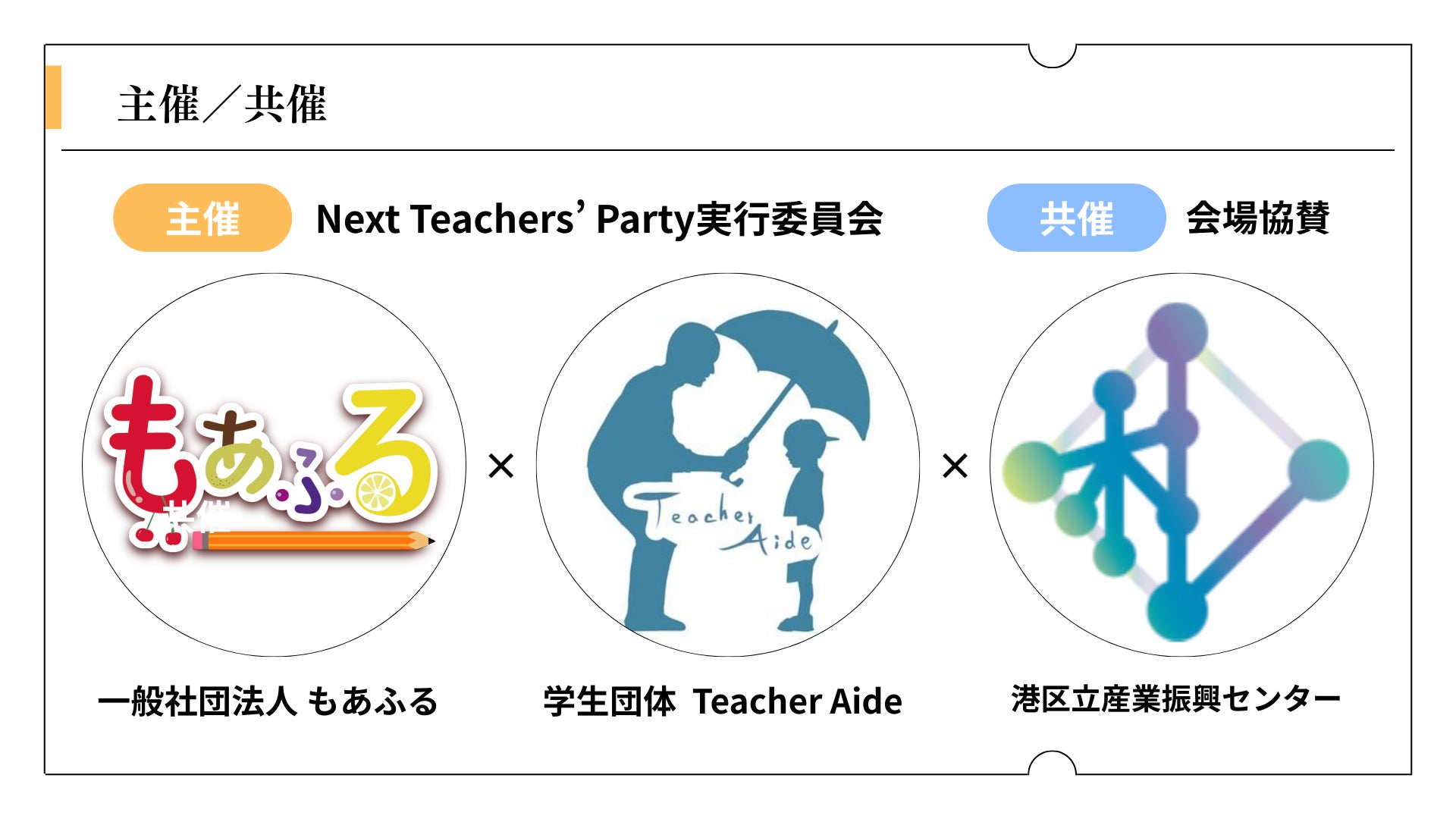 • 主催: Next Teachers' Party実行委員会(一般社団法人もあふる、学生団体TeacherAide)