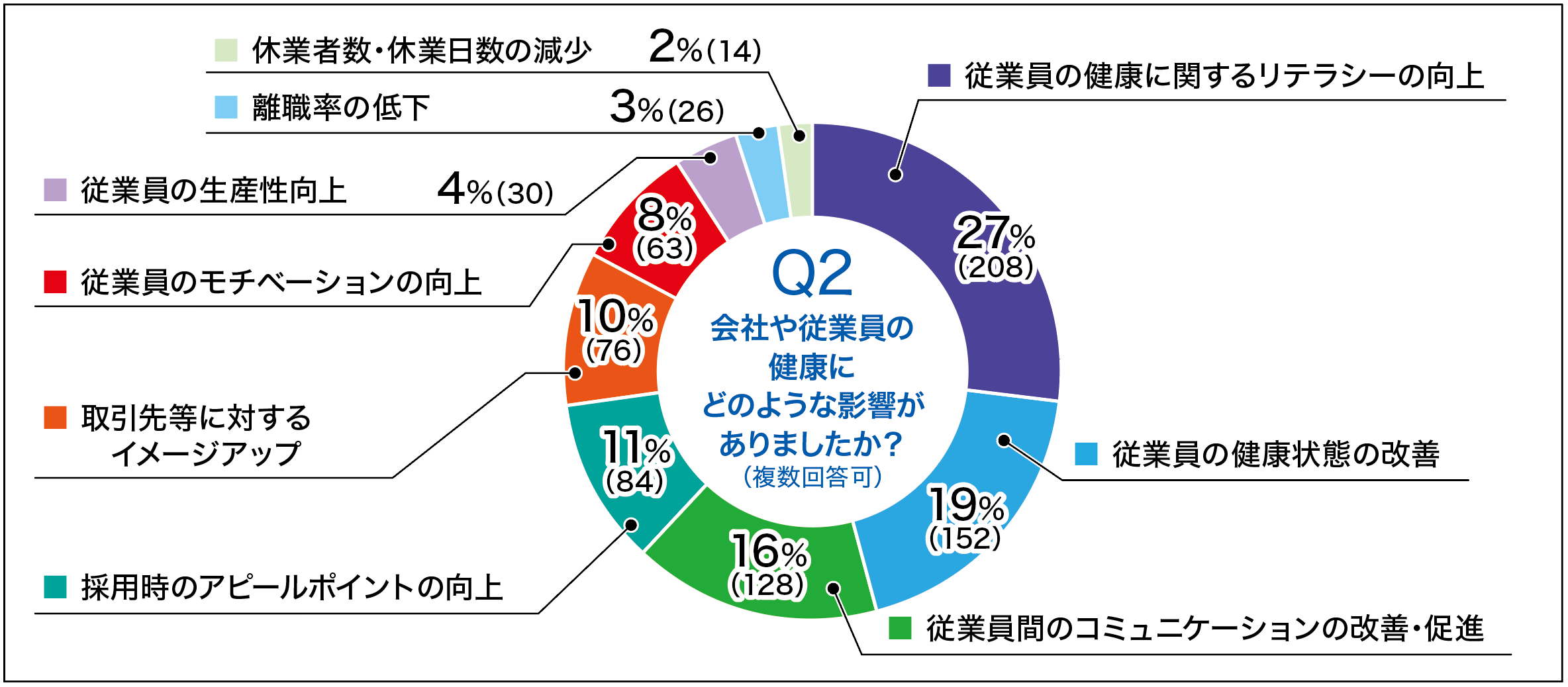 具体的に最も多かったのは 「健康リテラシーの向上(27%)」 で、続いて「従業員の健康状態の改善(19%)」、「従業員間のコミュニケーション改善・促進(16%)」が挙がりました(Q2)。