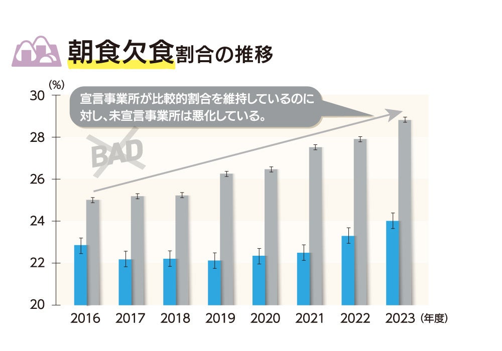 健康宣言事業所では、比較的割合を維持している一方で未宣言事業所では、年々、朝食欠食者の割合が悪化しています。